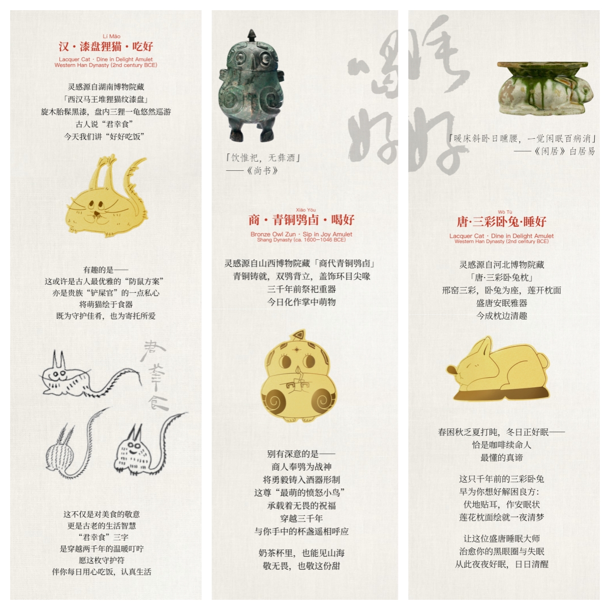 YIN 非常巧妙地从中国古代文物中选取了三个萌萌的动物,做成了古物萌金守护符,寄托了在新年「吃好喝好睡好」的美好祝福!在马年即将到来之际,还特别推出了「舞马」金片!它们都穿过时光,向我们传递着关于生活、关于人、关于审美情趣的小小思考。这些很有灵气的小金片,既可以当做一枚小书签日常使用,也可以放在手机壳里成为守护符,还可以送给你的朋友或者家人作为特别的新年礼!