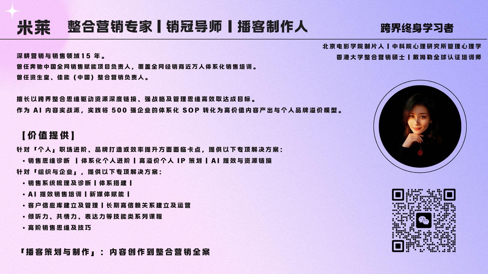 从“一只鼠标卖 4200 万”的商业奇观,到“假装艺术收藏家”的金融销冠案例;从苏格拉底提问法到乔哈里视窗的沟通哲学。李桢老师将用最接地气的实战经验告诉你:AI 落地企业本质上不是技术问题,而是工程化问题;对于个人而言,比提示词更重要的,是你的业务洞察力。