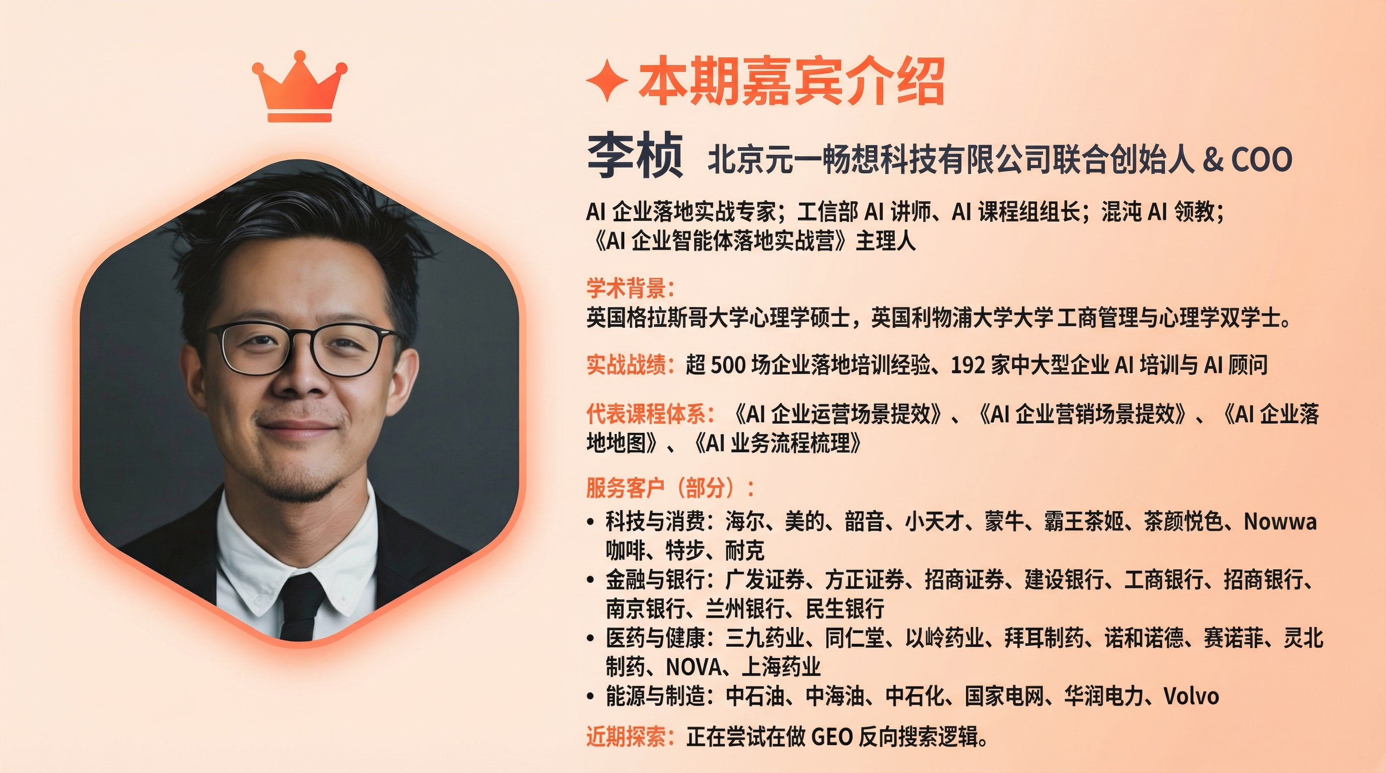 本期嘉宾 李桢,是一位拥有心理学背景的 AI 实战专家,也是工信部 AI 讲师和混沌 AI 领教 。他曾经历过元宇宙业务跌去 95% 的至暗时刻 ,却靠着“被逼无奈”的 AI 转型,在两年内跑通了 超 500 场 企业培训,帮助 192 家 中大型企业落地 AI 。