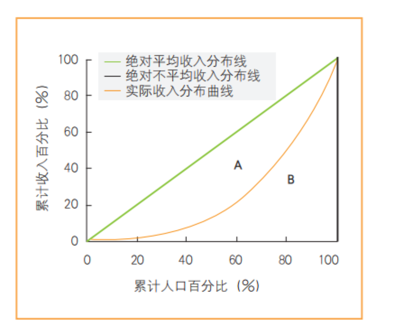 基尼系数是根据洛伦茨曲线,即收入分布曲线计算的。横轴是累计人口百分比,纵轴是累计收入百分比。对角线上的斜线是绝对平均的收入分布线,垂直纵线是绝对不平均的收入分布线,斜线和垂直纵线之间的曲线是通常见到的实际收入分布曲线。斜线和曲线之间的面积A,相当于用于不平均分配的那部分收入。基尼系数等于A/(A+B),经济学含义是用于不平均分配那部分收入占全部收入的比例。