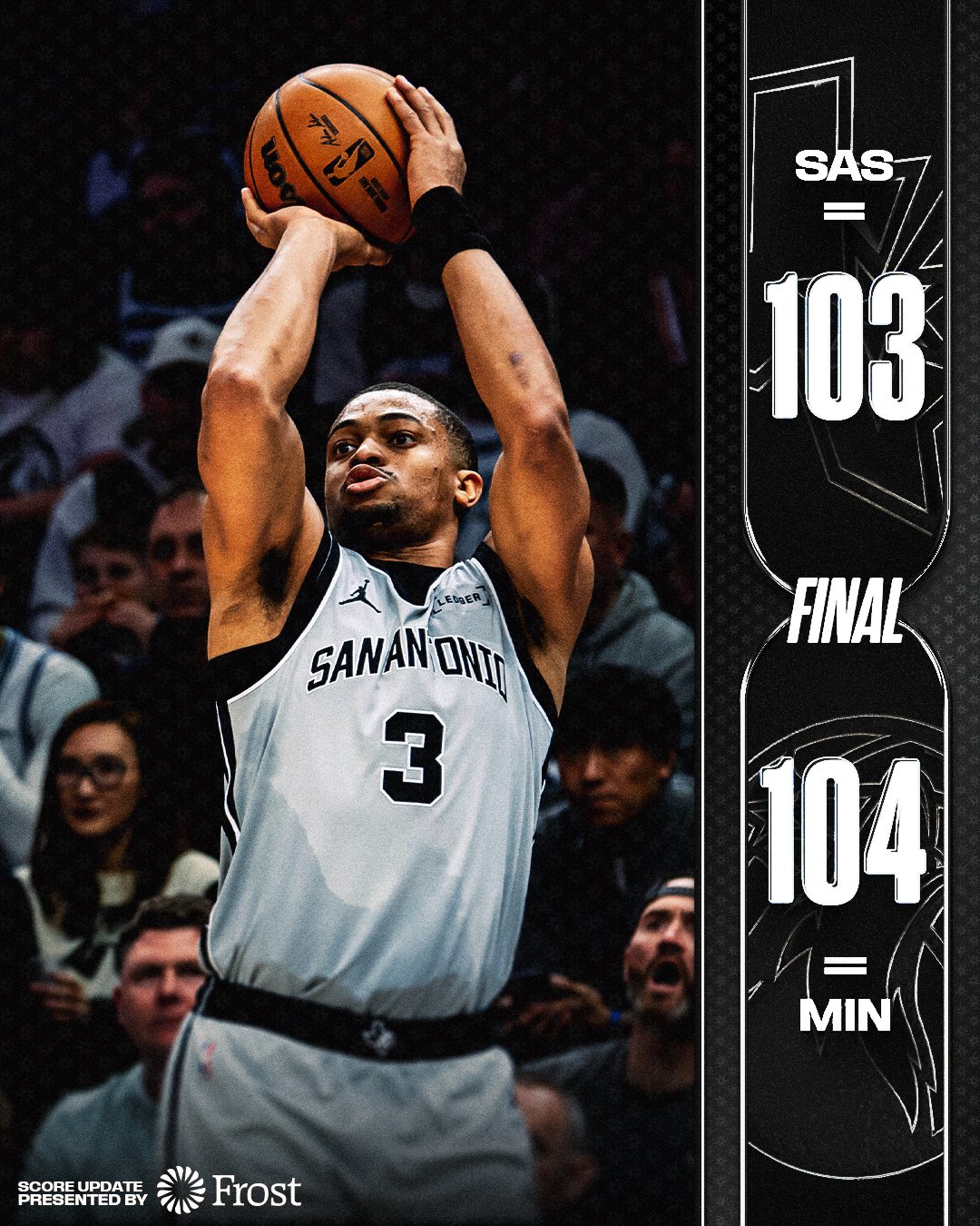 到此阶段,马刺在节奏掌控、防守强度和内线统治力上都占据明显优势,看起来像是一场客场大胜的节奏。然而,第四节一切都变了。森林狼单节打出33-18的高潮,最终由爱德华兹在比赛还剩16.8秒时命中一记投篮完成绝杀。爱德华兹全场得到23分,上半场和第三节手感低迷,但关键时刻彻底苏醒:先是在2:19时用转身跳投将比分反超至100-98,随后锁定胜局。