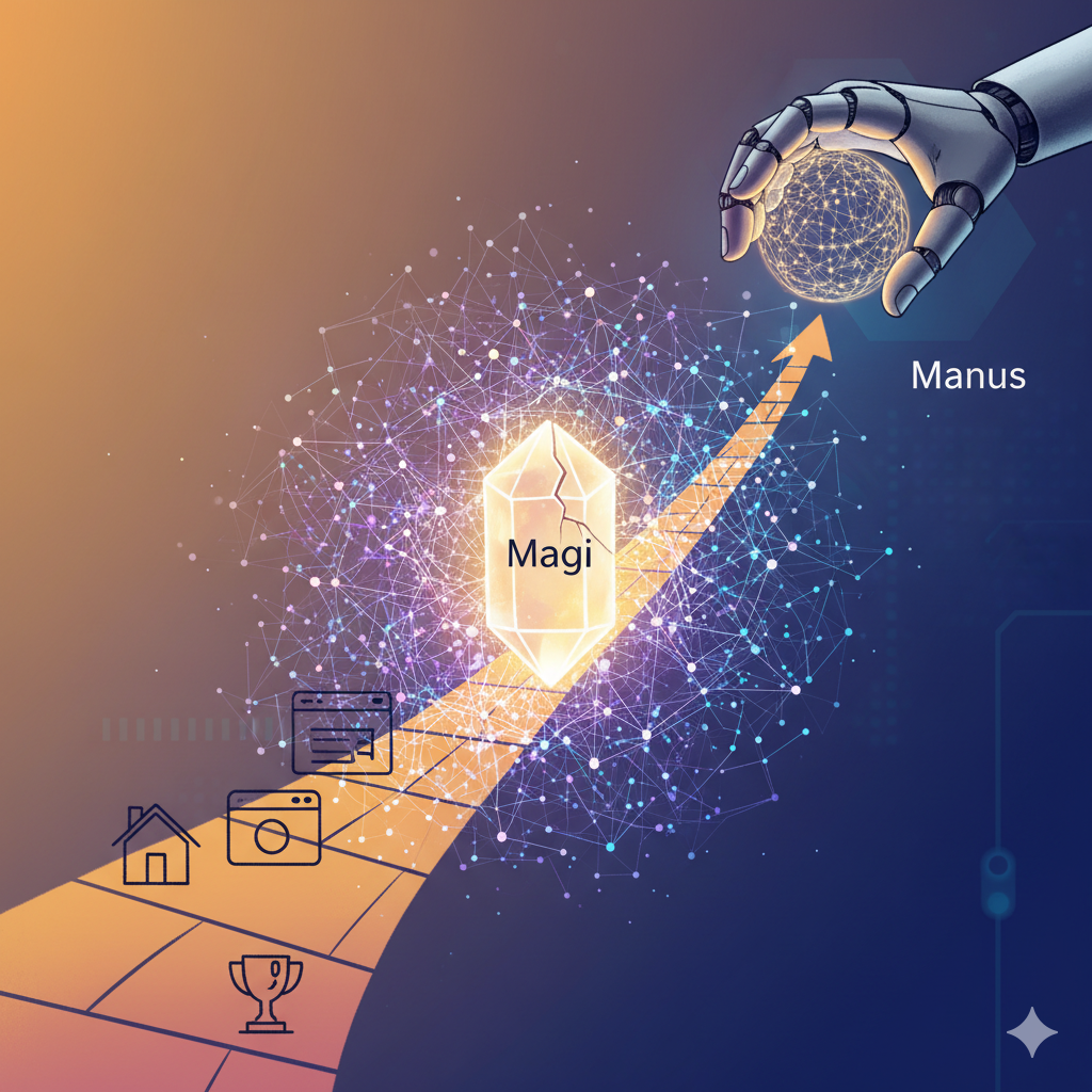 A visual metaphor of evolution and growth. A path ascends from the lower left, starting with sketched symbols of a home, a browser icon, and a trophy. As the path rises, it transforms into a dense, intricate neural network. In the center, a brilliant, faceted crystal labeled “Magi” is shown with a subtle crack, from which light escapes. The path culminates at the top right in a powerful, minimalist robotic hand (Manus) that is firmly holding a glowing orb of data and light. The background transitions from warm, personal tones to cool, technological hues. Style is conceptual, clean, and symbolic.