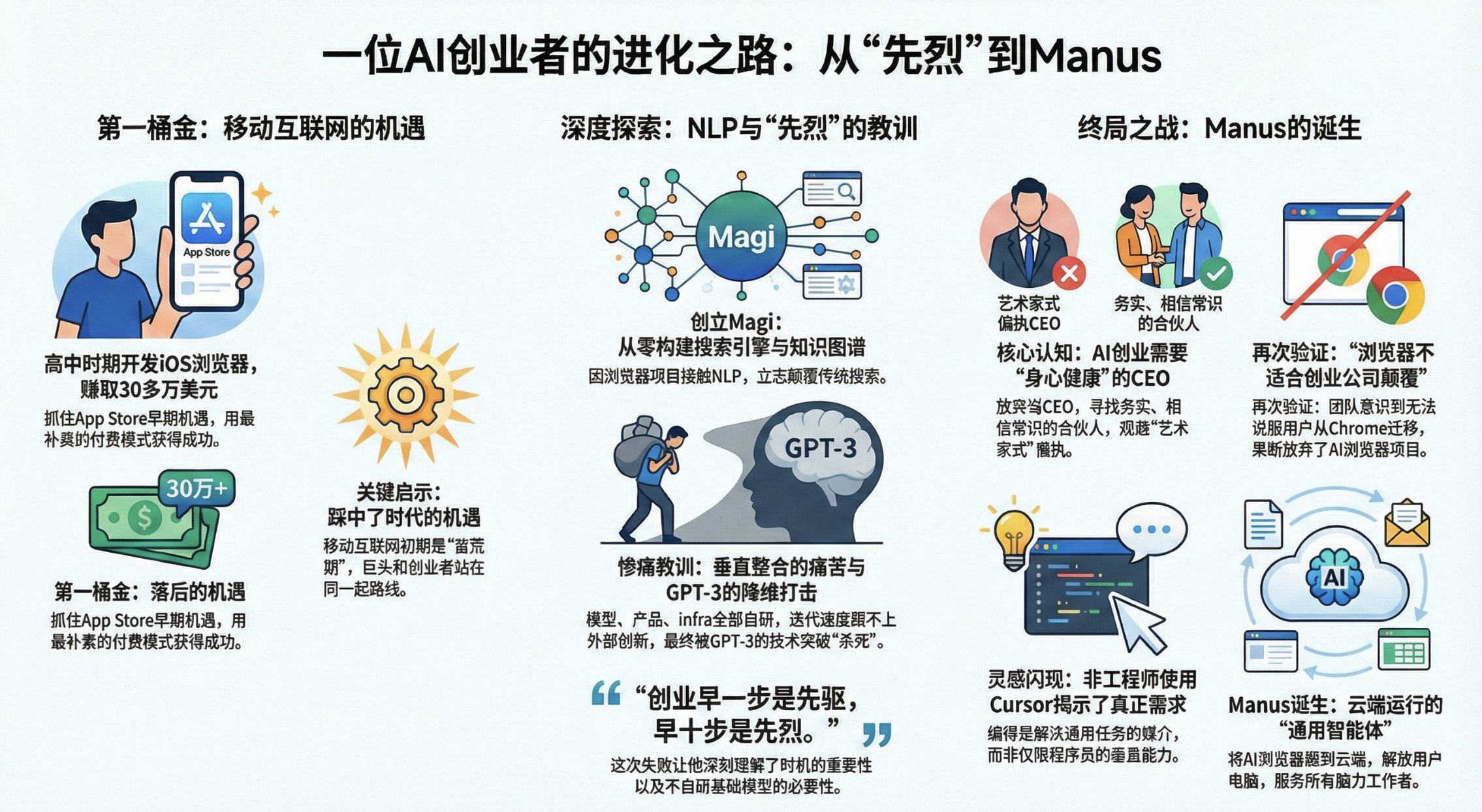 他20岁登上《福布斯》封面,高中时开发的浏览器就赚了30万美金;他的知识引擎项目曾是技术理想的“巅峰”,却差点被 GPT-3 的横空出世“震碎”世界观。他是季逸超(Peak),一个在科学与商业双重熏陶下长大的天才,如今是估值数十亿美金的通用 AI Agent 公司 Manus 的缔造者之一。本期内容,我们将沿着季逸超的成长轨迹,深入这位技术天才的内心世界。你会听到一个少年成名的开发者,如何经历技术范式的“信仰崩塌”与重建;一个曾经的“艺术家”型创业者,又如何蜕变成为崇尚理性与数据飞轮的商业领袖。这不仅仅是一个成功者的简历,更是一部关于天赋、挫败、转型与终极技术理想的个人史诗。
