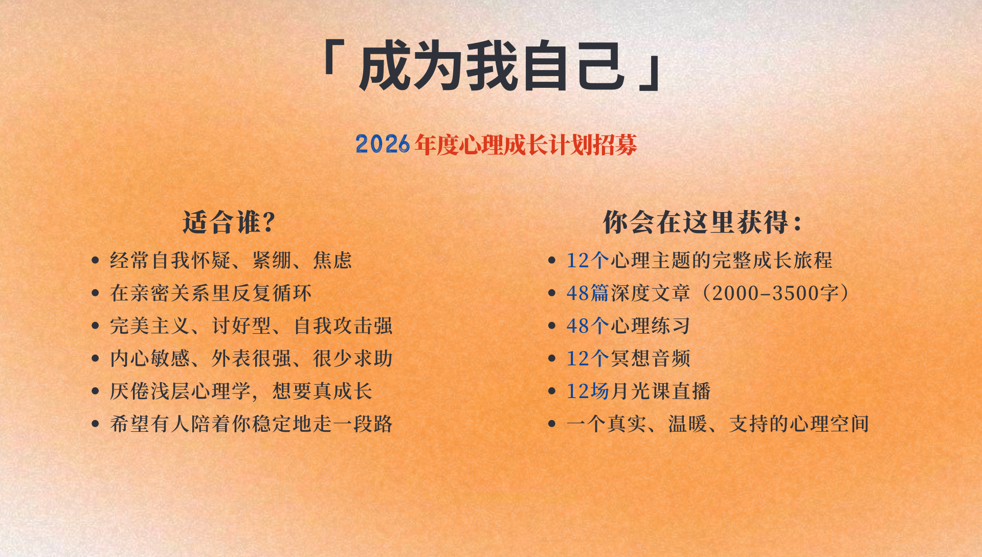 我也想和你分享一个很重要的转念:自毁不是失败的证据,而是你曾经非常努力想要活下来的证明。你不需要马上停止它,你只需要慢慢让自己知道:现在已经不是当年那个只能靠毁掉自己才能活下来的时候了。如果你愿意,欢迎你来这一期节目里,一起看看那个努力的幸苦的自己。