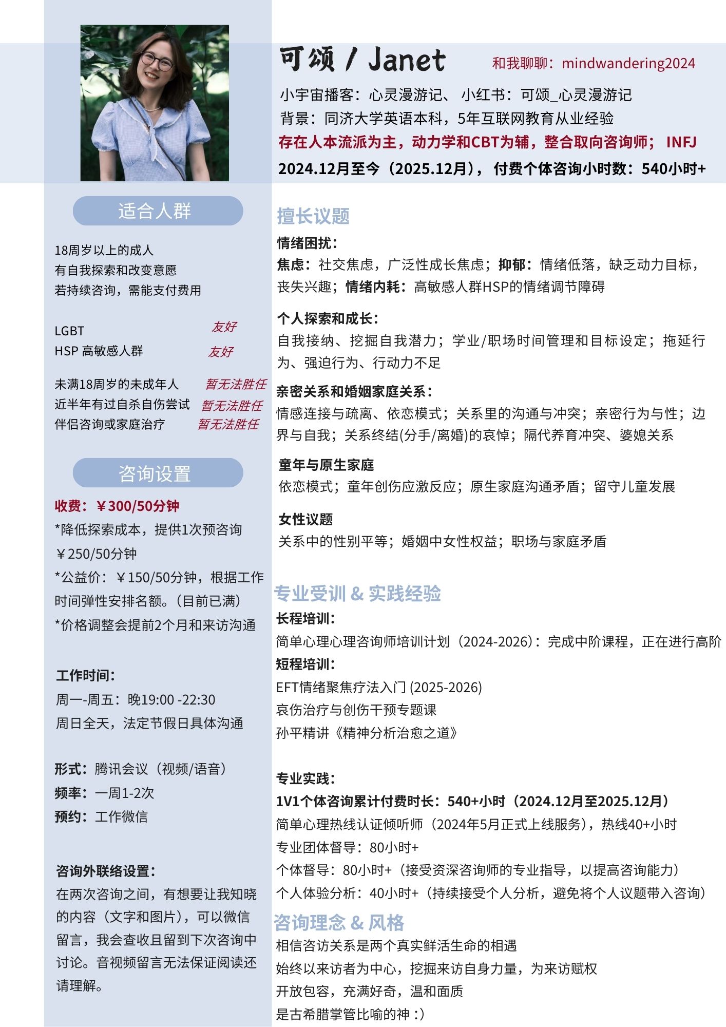 我是可颂,一名成长中的心理咨询师。目前累计咨询小时数580+小时。2026年新年招募新来访,如果你想要找个人聊聊,可以添加工作微信【mindwandering2024】,请备注“心理咨询”。