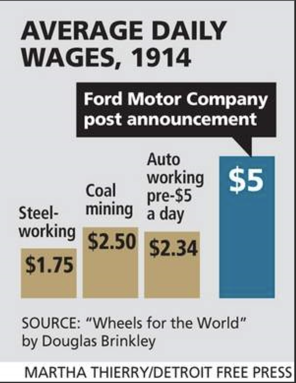 福特推出流水线的时候,是难得的全球总需求、美国总需求都在上升的时期,汽车产业更是这样——只要你的汽车更便宜,造的更多了,那就卖的出去(不像今天,总量过剩)。所以他们招聘的时候,制造业工人并不像今天这样过剩,他们不具备大幅降低工资还招到足够(从量和质量上的双方面足够)工人的条件
