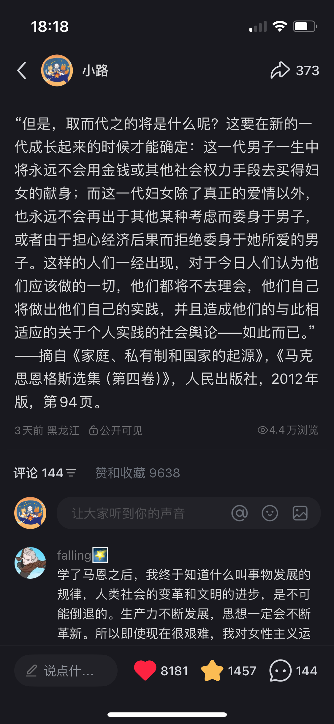 - 我会聊到:恩格斯不太为人所知但也是他知行合一的部分——与爱尔兰女工玛丽·伯恩斯姐妹长达一生的感情。如果把他们的故事匿名发上网,我相信又将是一场大型的社会实验。我们会一起看看,他拒绝法律婚姻的理论支撑是什么,而他最终在病榻前与丽琪结婚的决定,又包含着怎样复杂的情感。这部分,是关于他如何将理论信仰彻底融入个人生活的深刻体现。对于理论部分,也就是《家庭、私有制和国家的起源》,我们就留到下期深入聊聊!