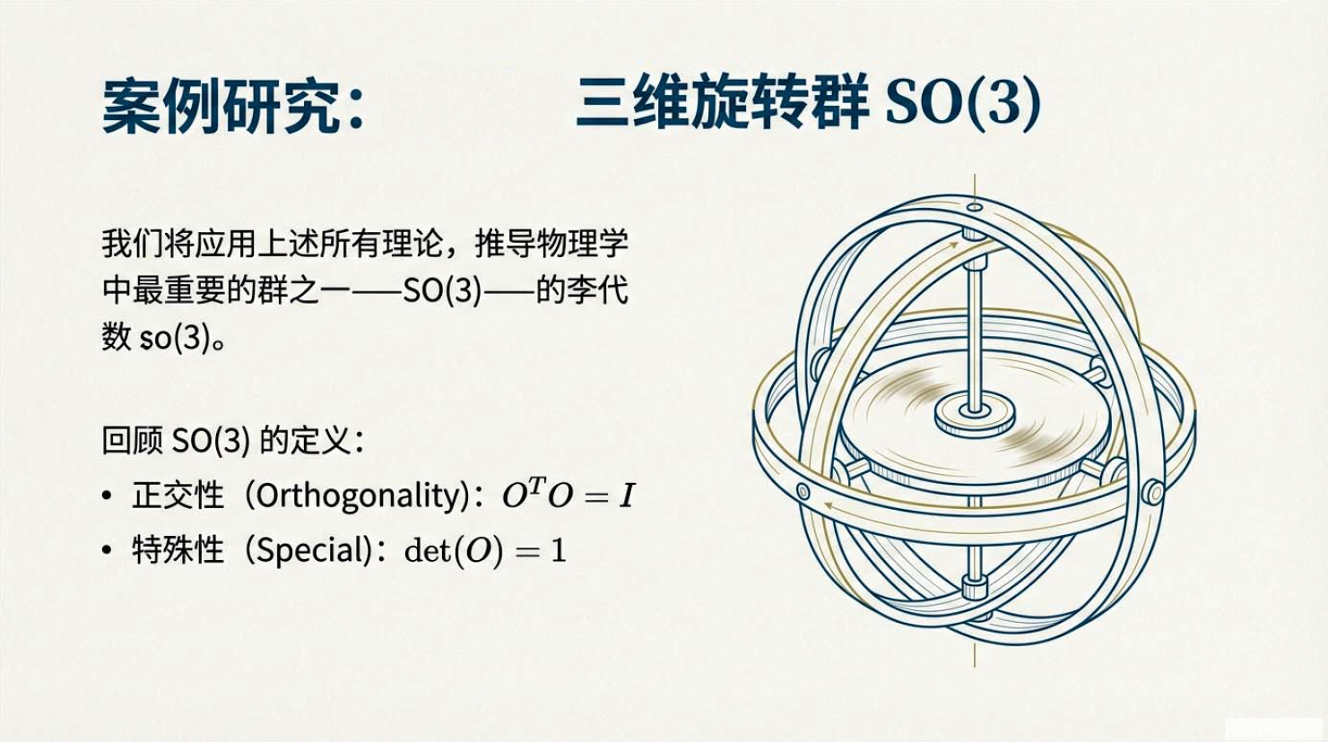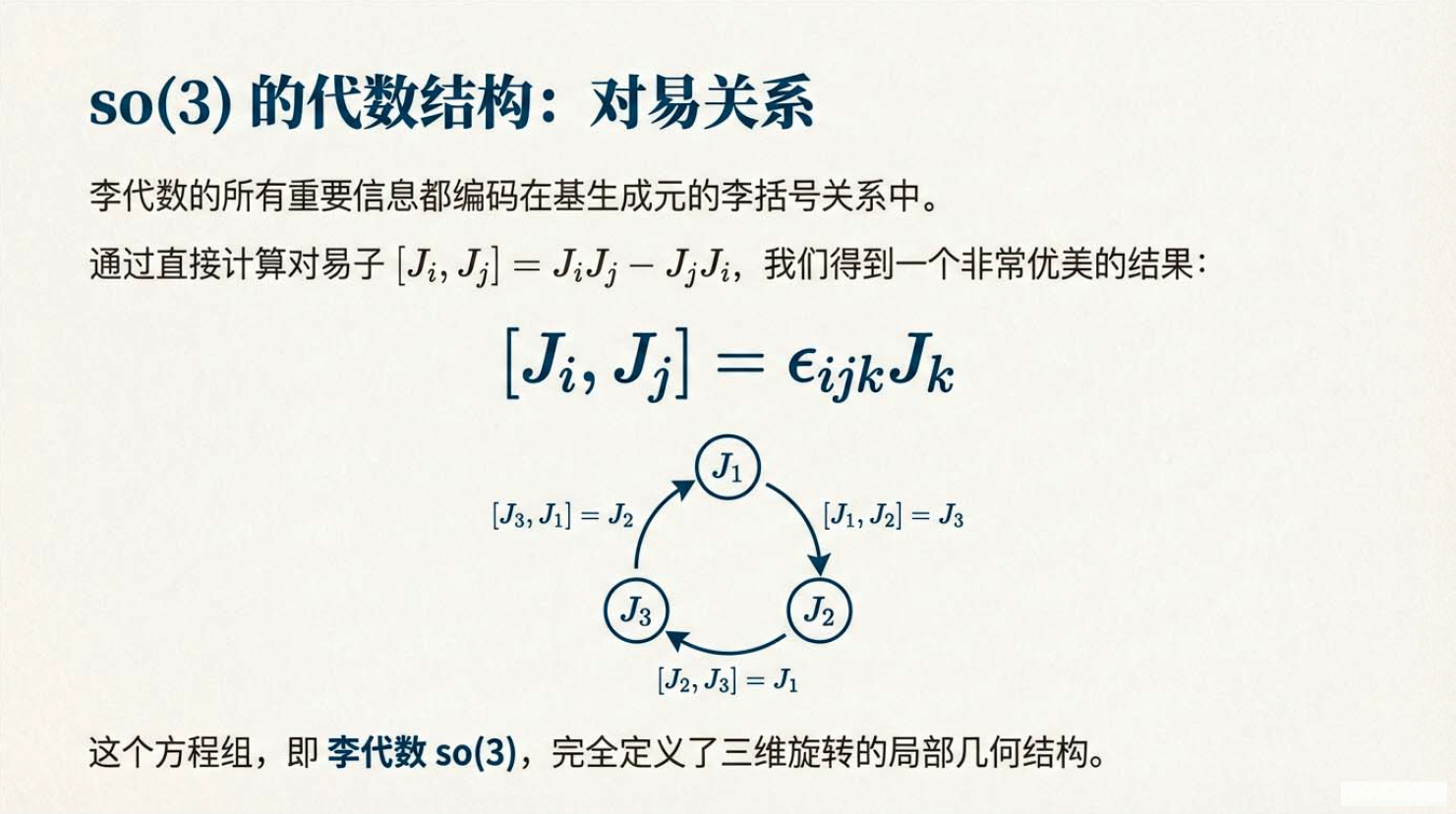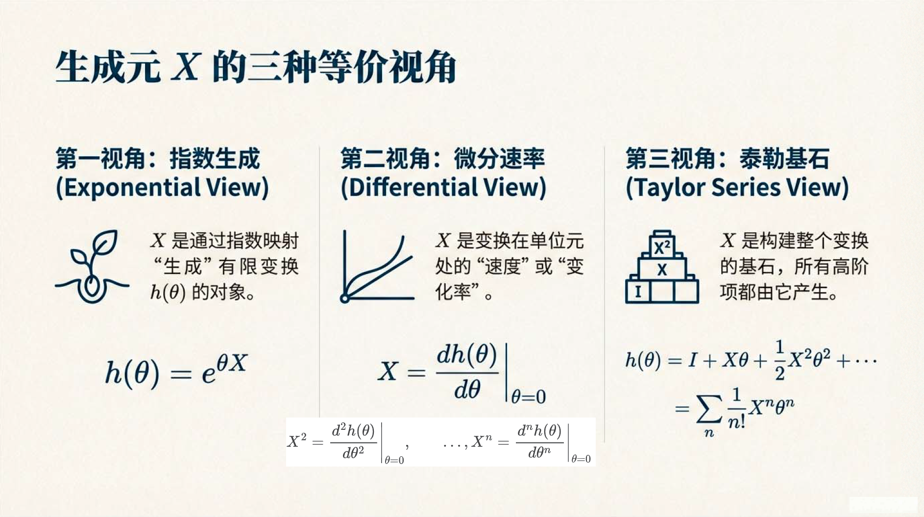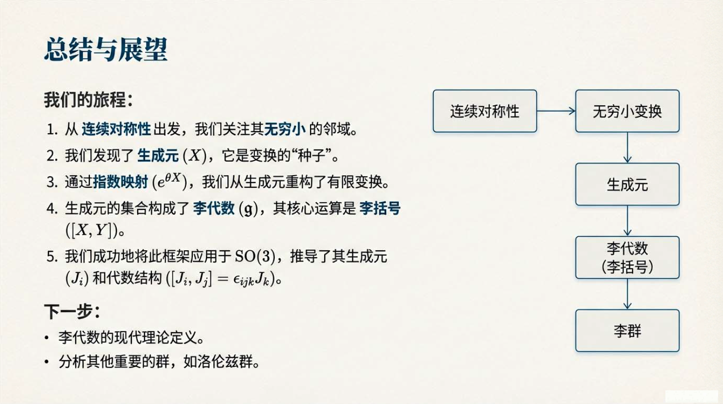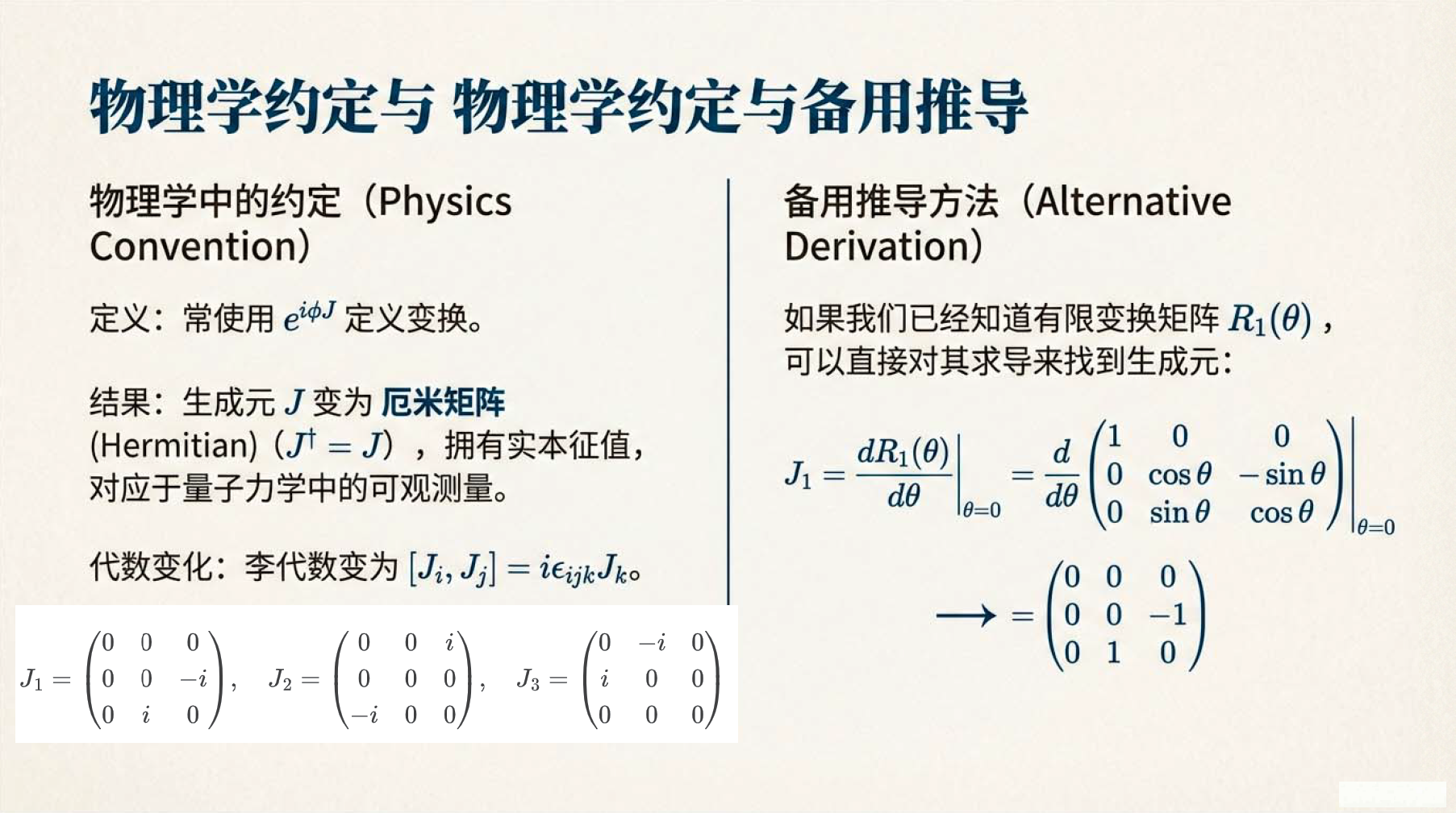 第7课视频的主要内容: 阐述了李代数作为连续对称性生成元的理论框架。内容涵盖了指数映射、李括号运算及BCH公式,解释了如何通过无穷小变换生成有限群元素。课文通过推导 SO(3) 的基生成元,展示了物理学中厄米算符的构建过程。