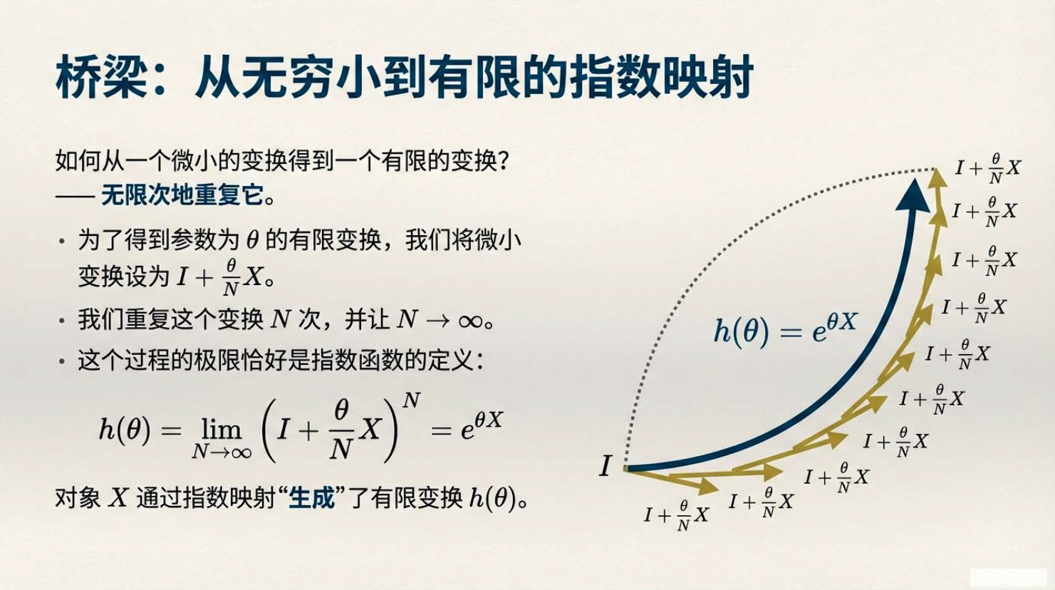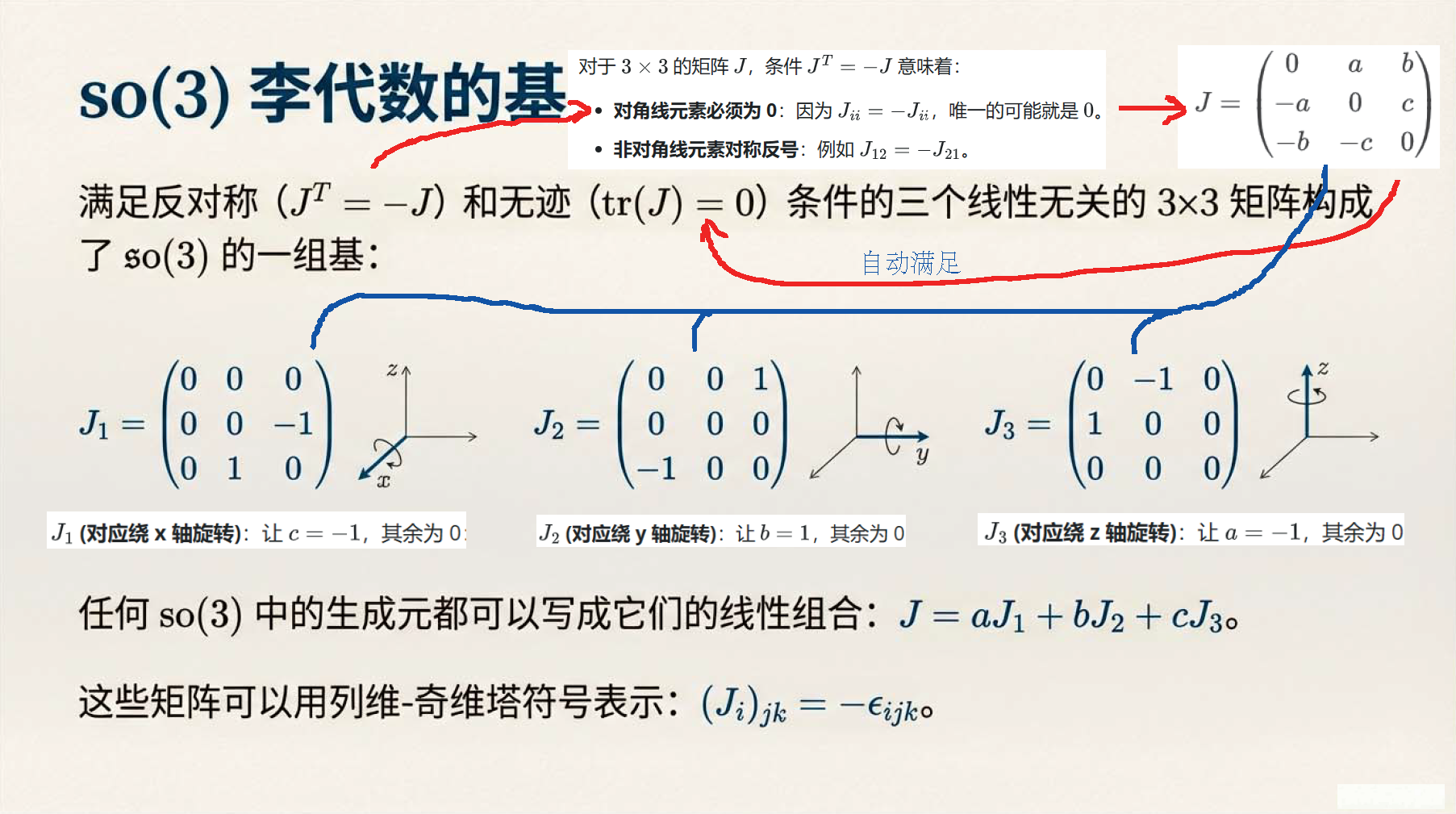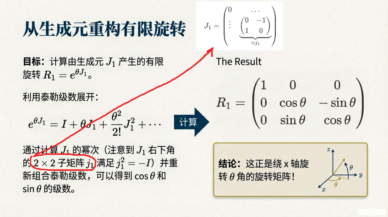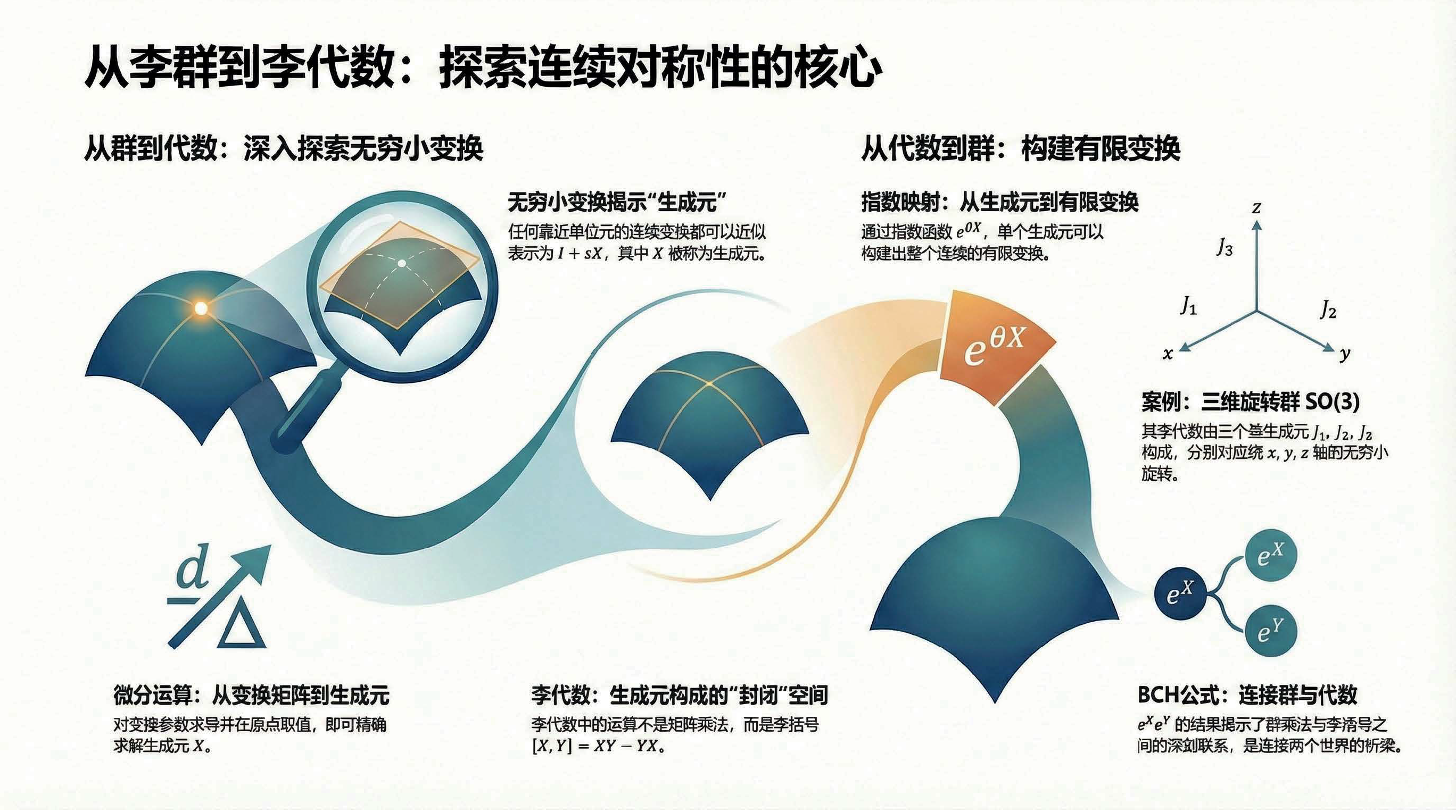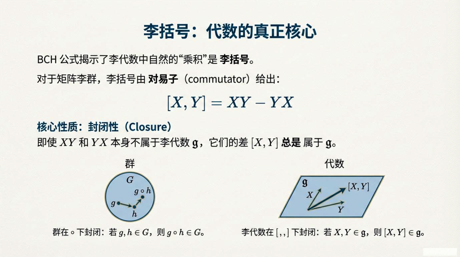 第7课视频的主要内容: 阐述了李代数作为连续对称性生成元的理论框架。内容涵盖了指数映射、李括号运算及BCH公式,解释了如何通过无穷小变换生成有限群元素。课文通过推导 SO(3) 的基生成元,展示了物理学中厄米算符的构建过程。