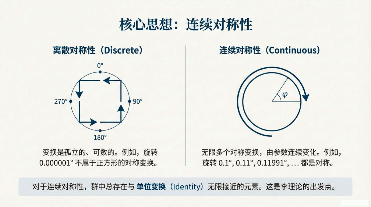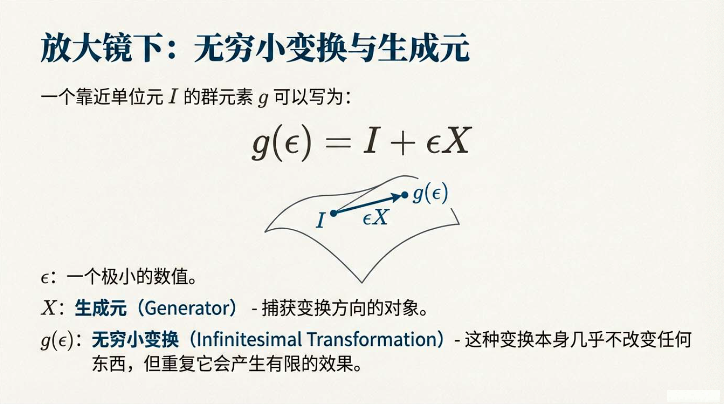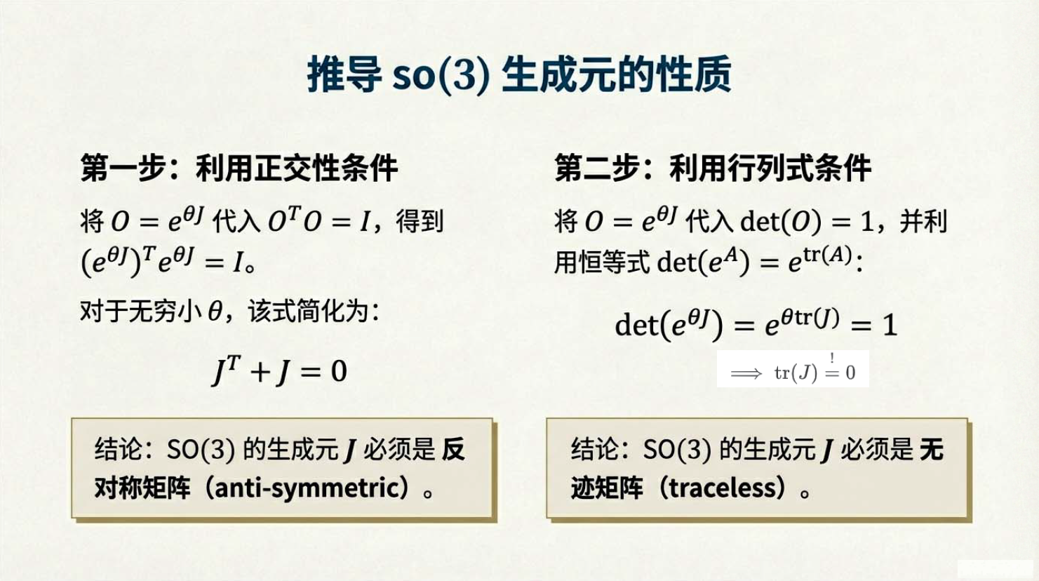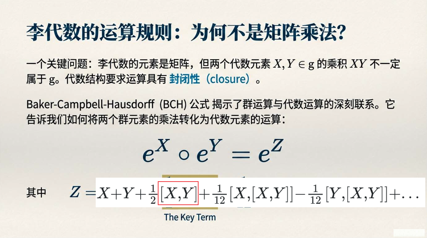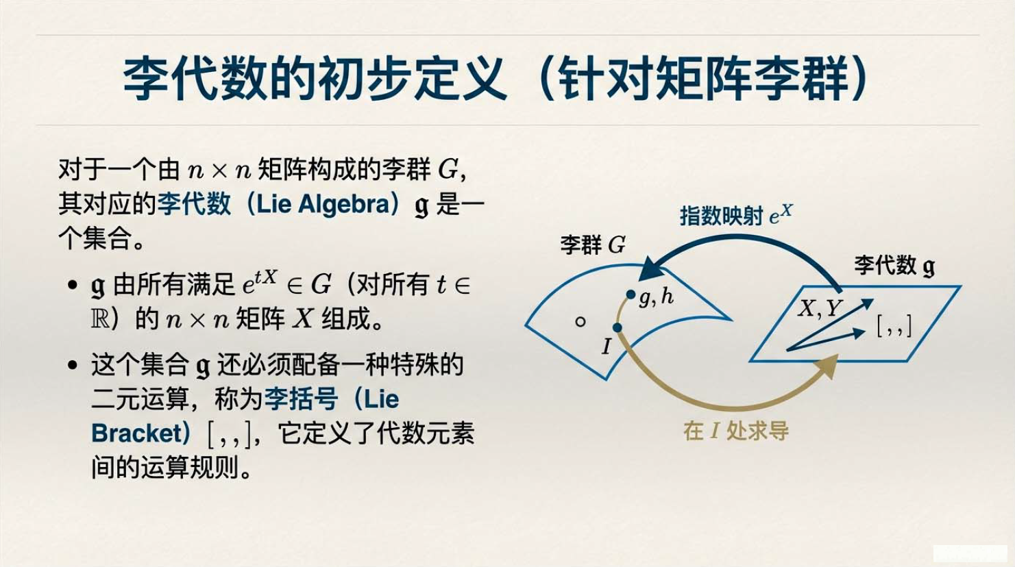 第7课视频的主要内容: 阐述了李代数作为连续对称性生成元的理论框架。内容涵盖了指数映射、李括号运算及BCH公式,解释了如何通过无穷小变换生成有限群元素。课文通过推导 SO(3) 的基生成元,展示了物理学中厄米算符的构建过程。
