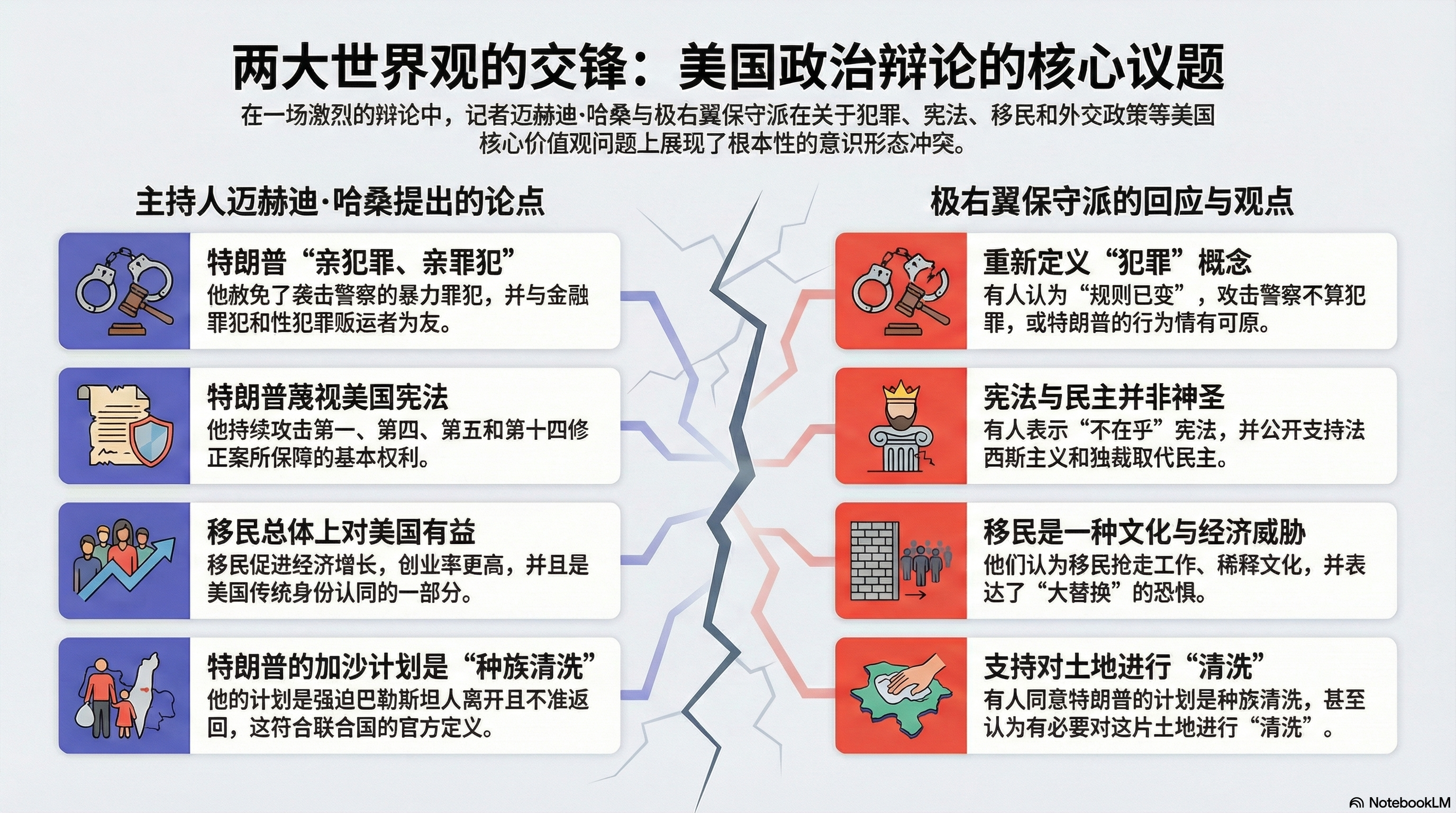 本期节目,我们将带你逐一拆解视频中的四大战场:从特朗普的犯罪指控到宪法之争,从种族大取代的恐惧到加沙地带的人道危机。