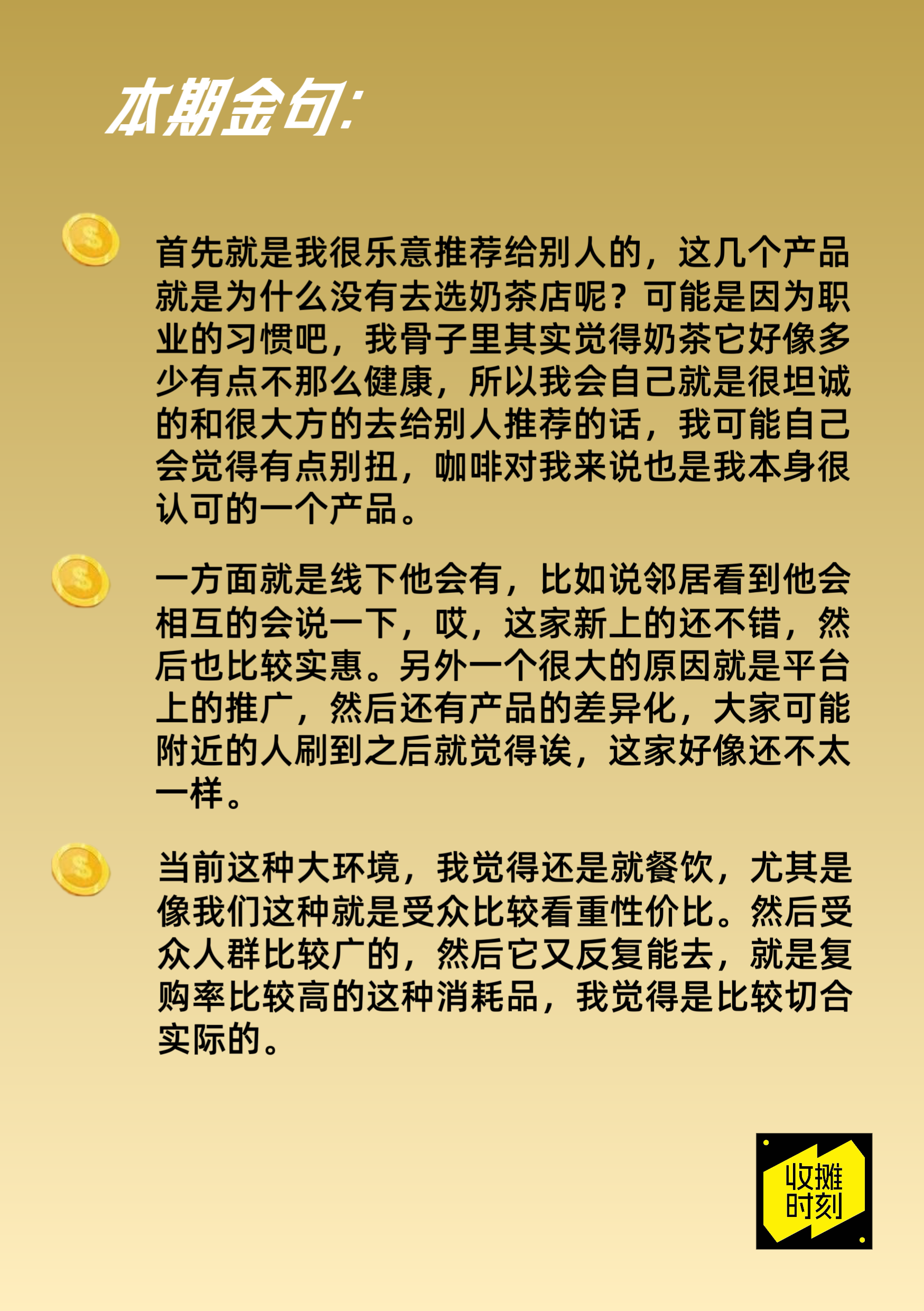 10:40 曾经加盟医美护肤品,闲不住热爱折腾,后加盟咖啡店,强调产品健康属性和差异化竞争。