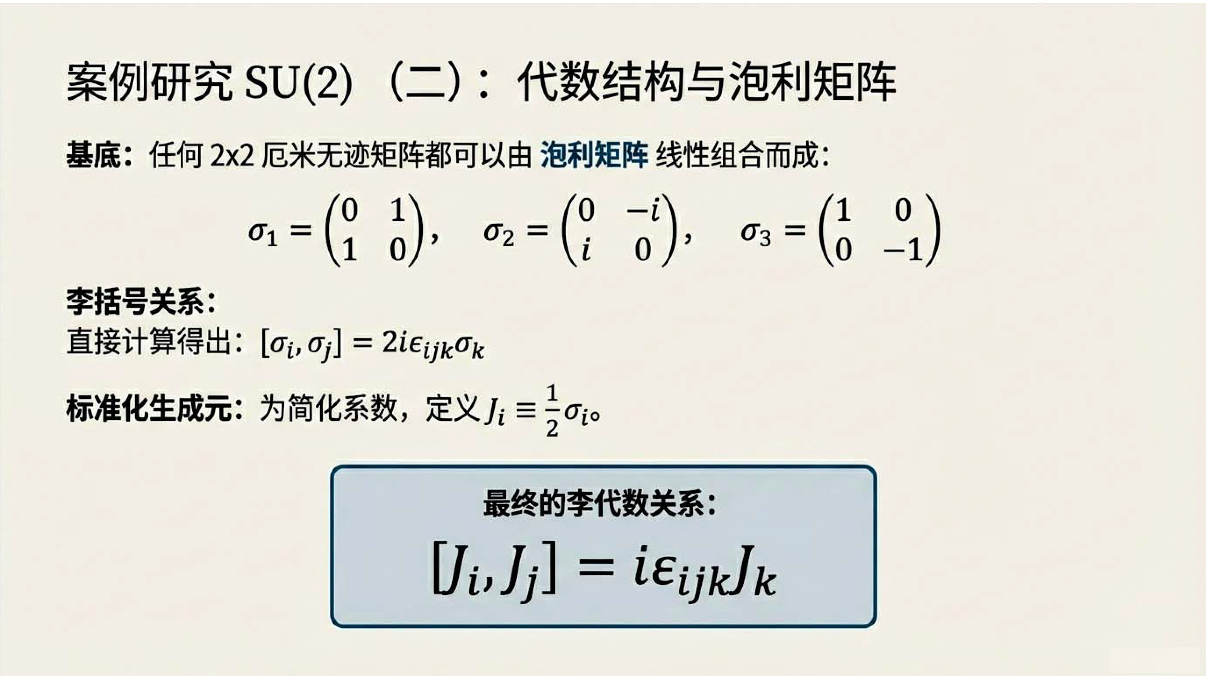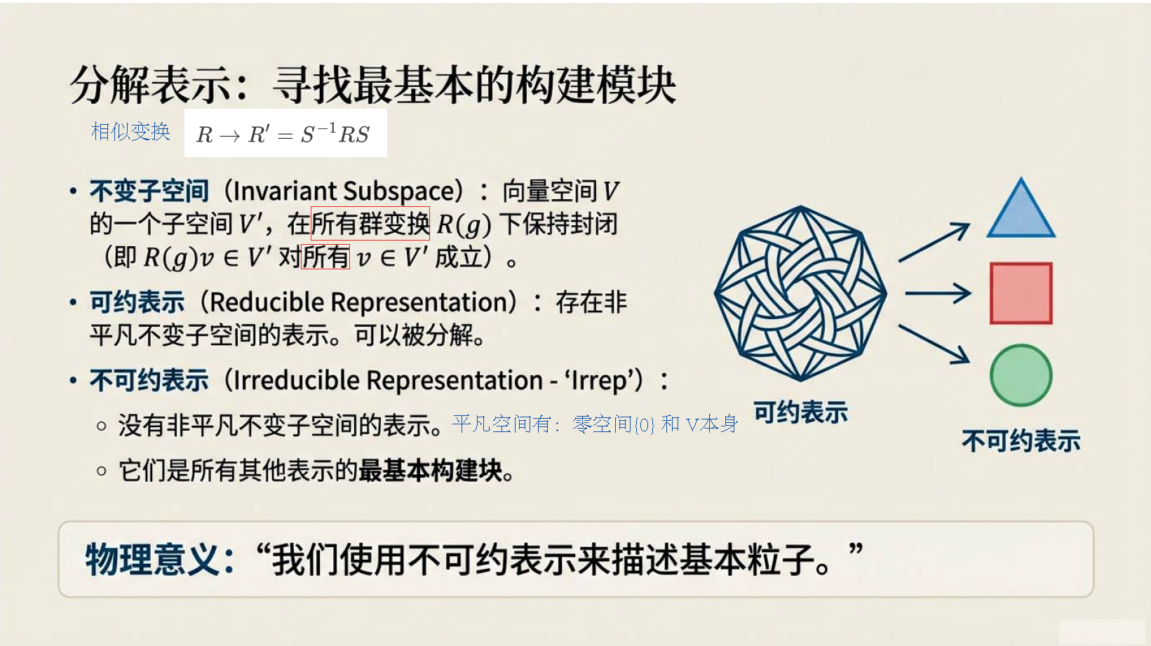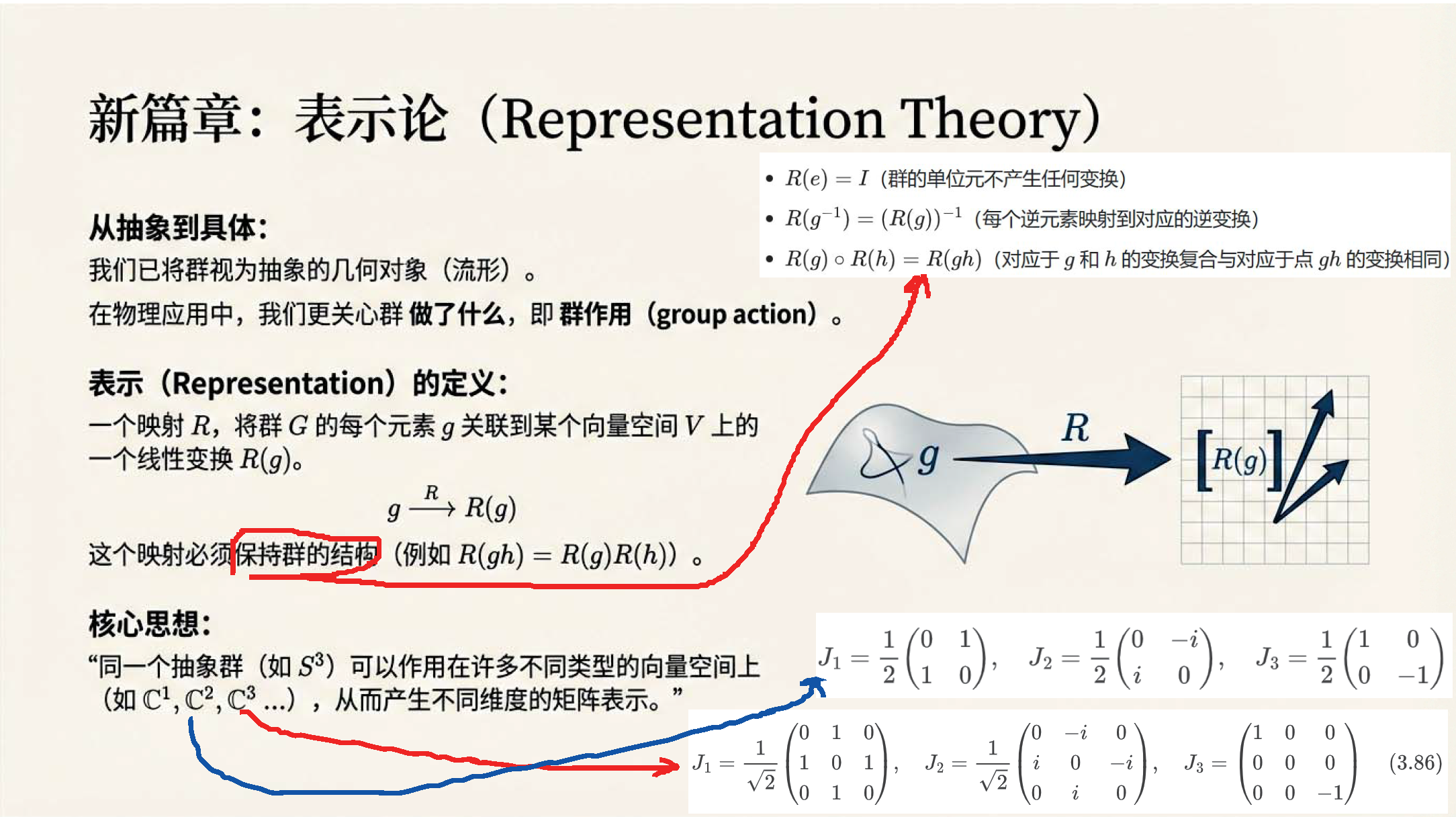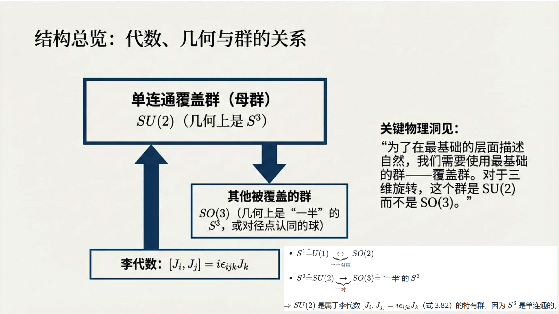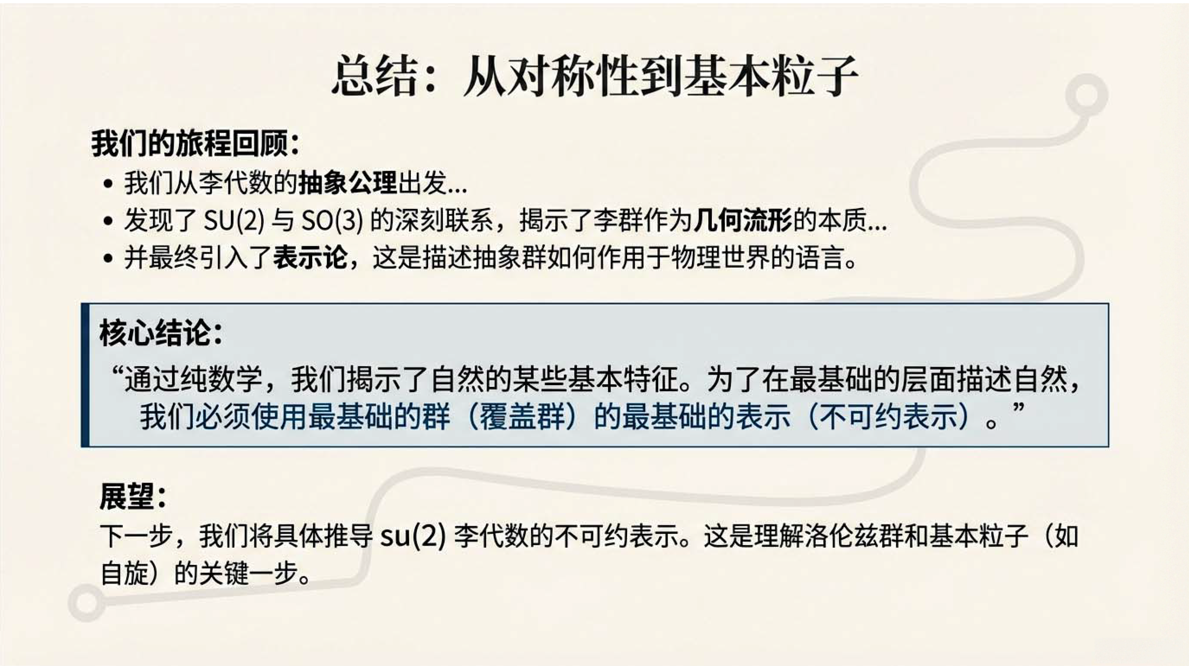 第8课视频的主要内容:阐述了李代数的抽象公理,并通过推导证明 SU(2) 生成元具有厄米无迹性质。课程强调 SU(2) 作为单连通流形,是 SO(3) 的特有覆盖群。此外,本课引入了表示论,探讨了如何利用不可约表示、不变子空间及舒尔引理来构建和标记物理系统的数学描述。