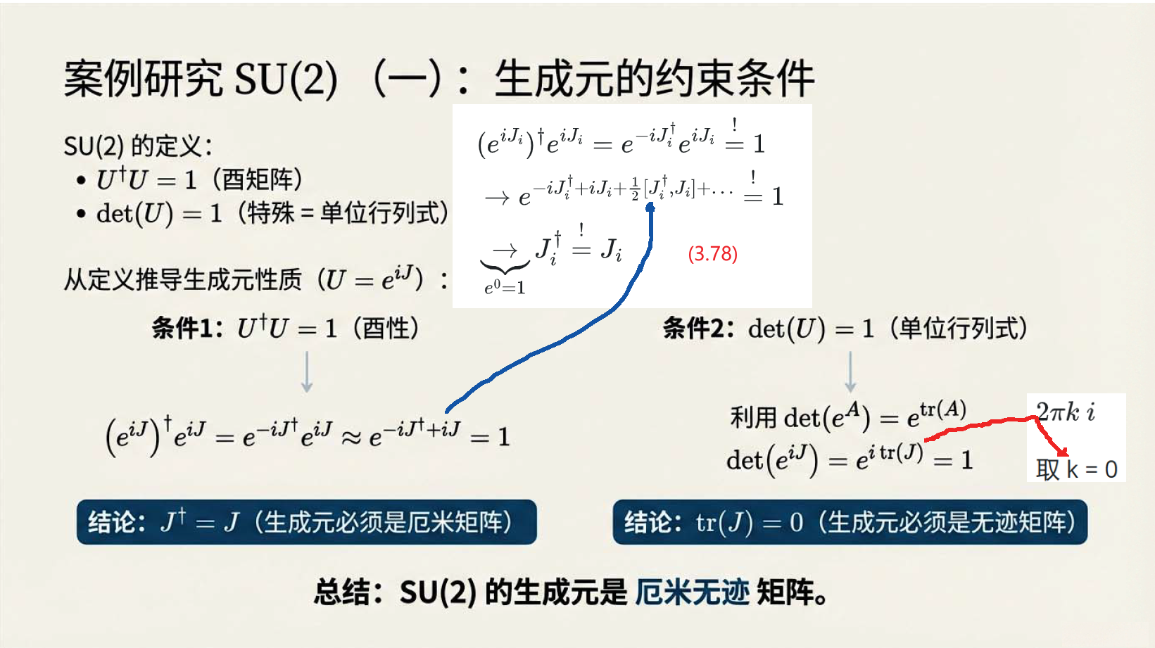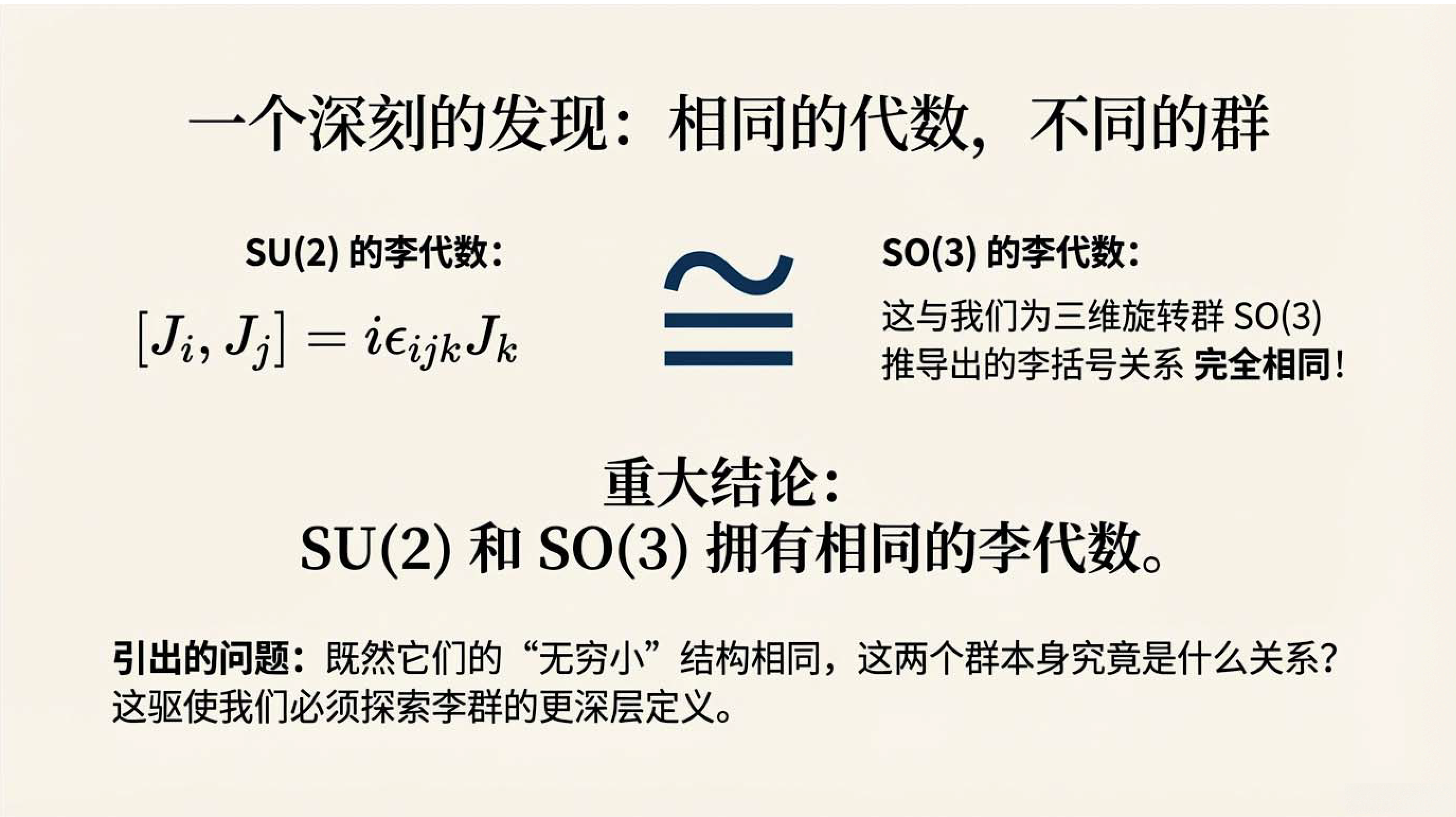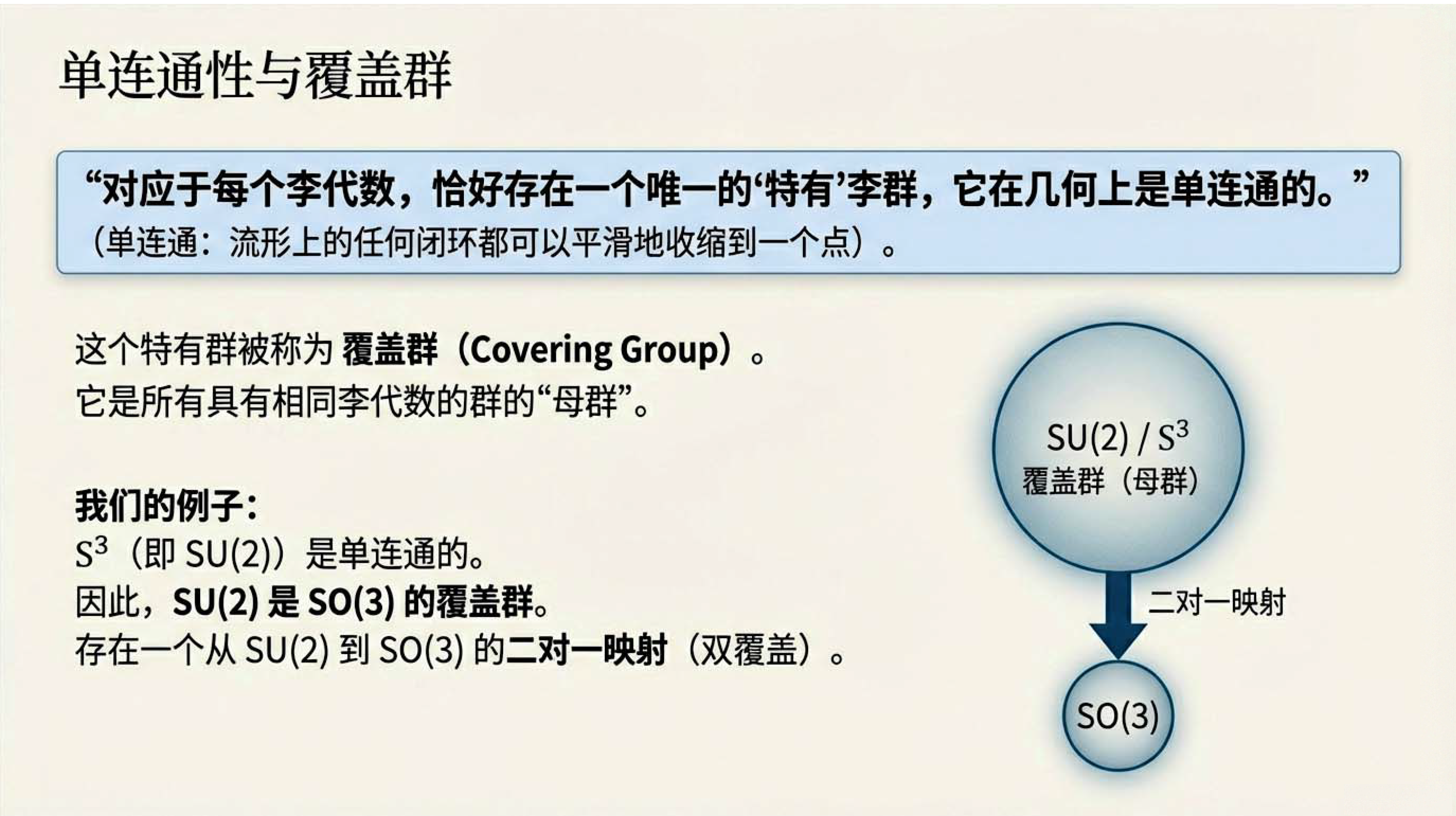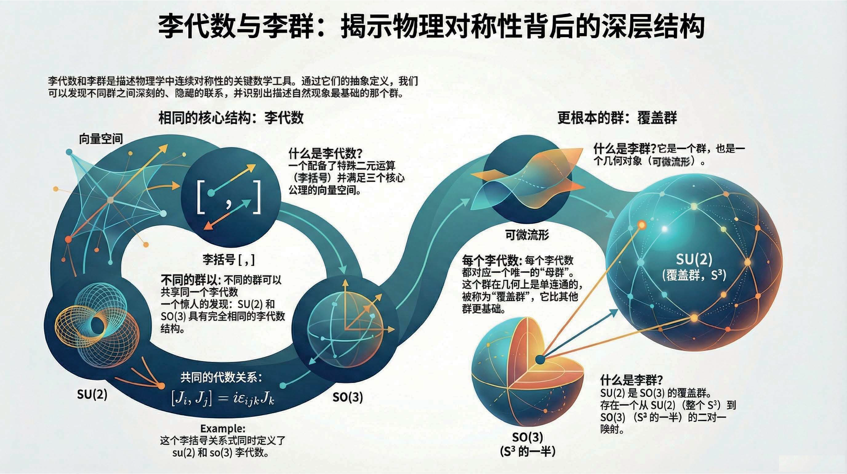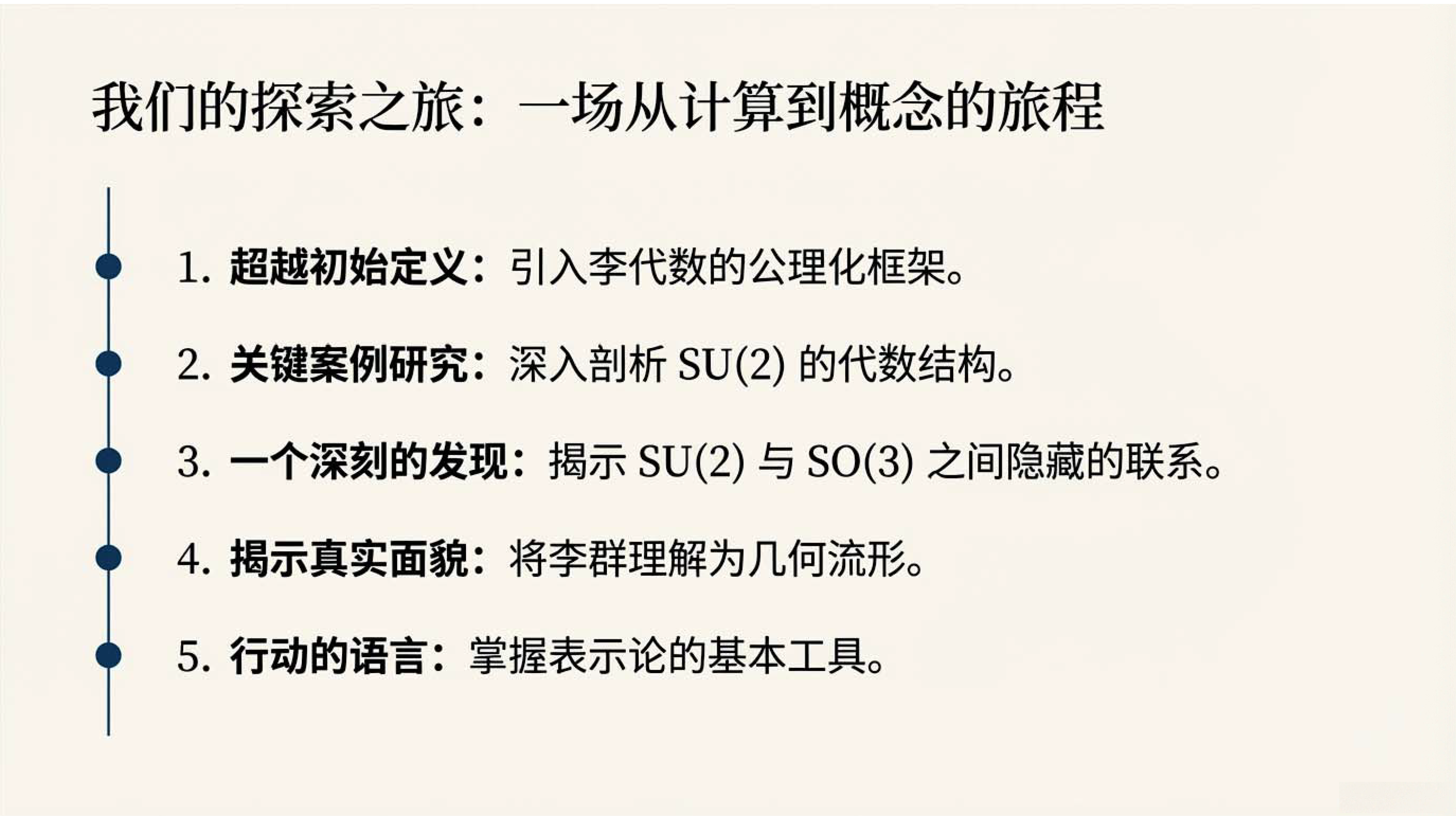 第8课视频的主要内容:阐述了李代数的抽象公理,并通过推导证明 SU(2) 生成元具有厄米无迹性质。课程强调 SU(2) 作为单连通流形,是 SO(3) 的特有覆盖群。此外,本课引入了表示论,探讨了如何利用不可约表示、不变子空间及舒尔引理来构建和标记物理系统的数学描述。