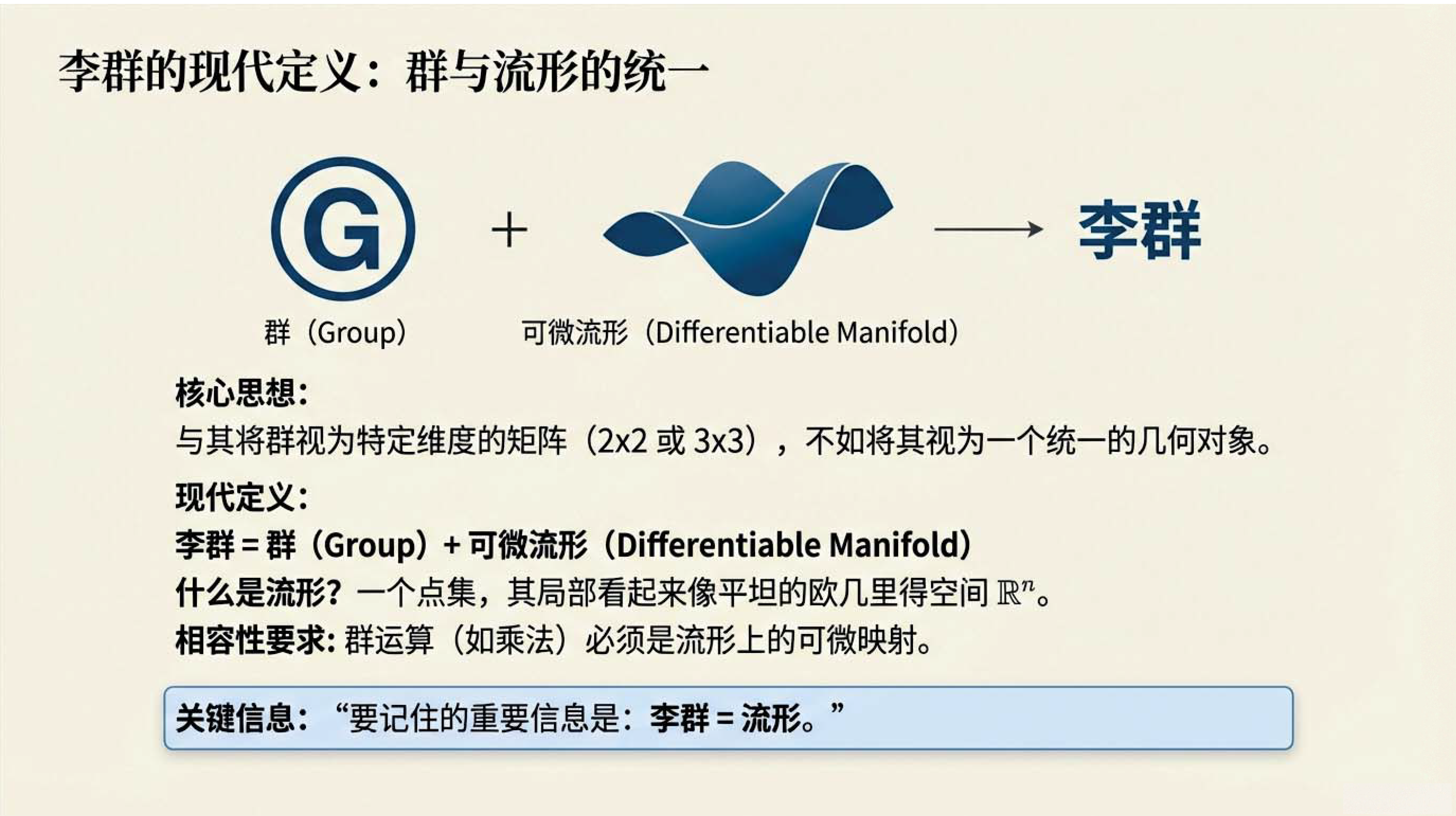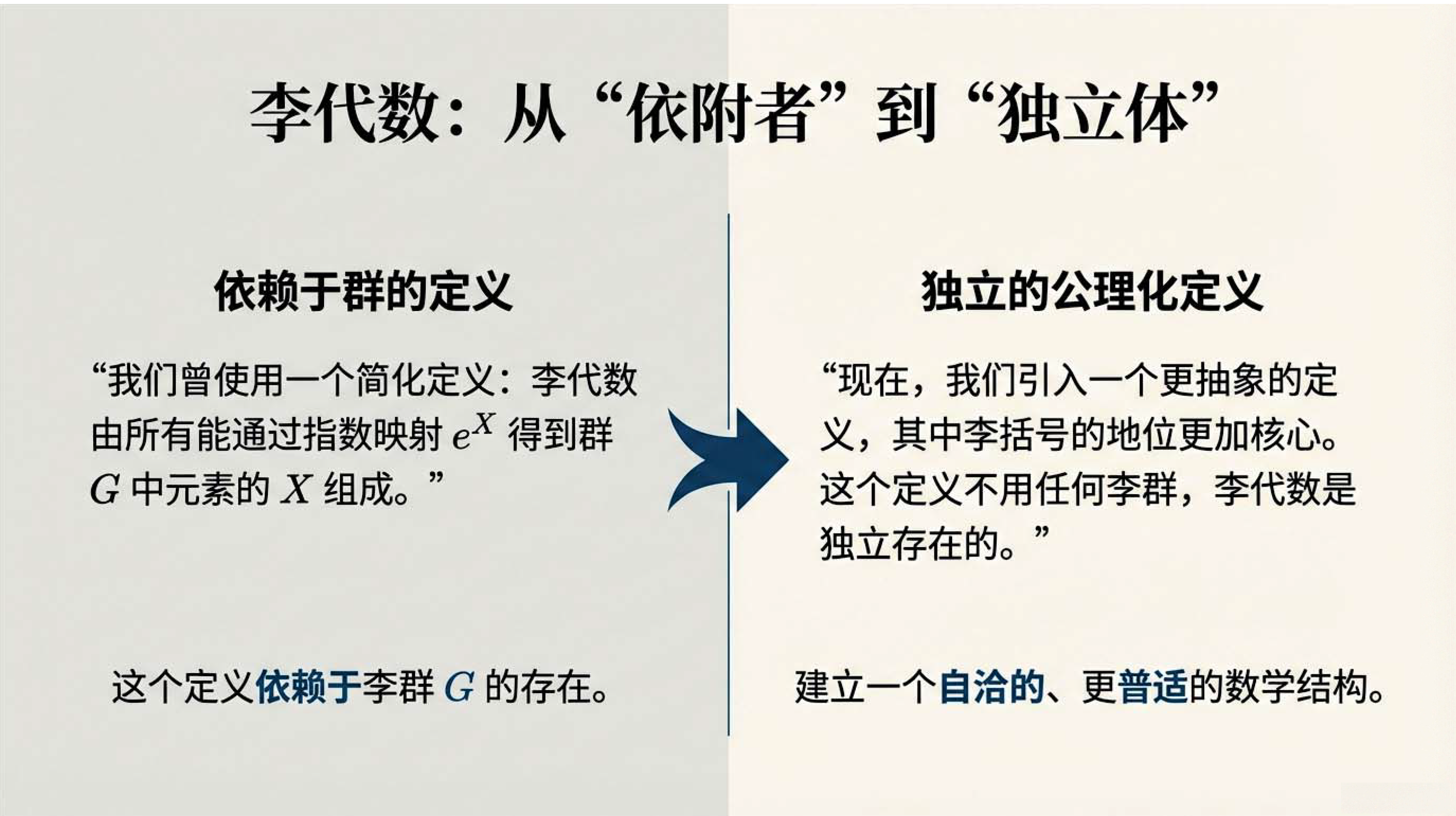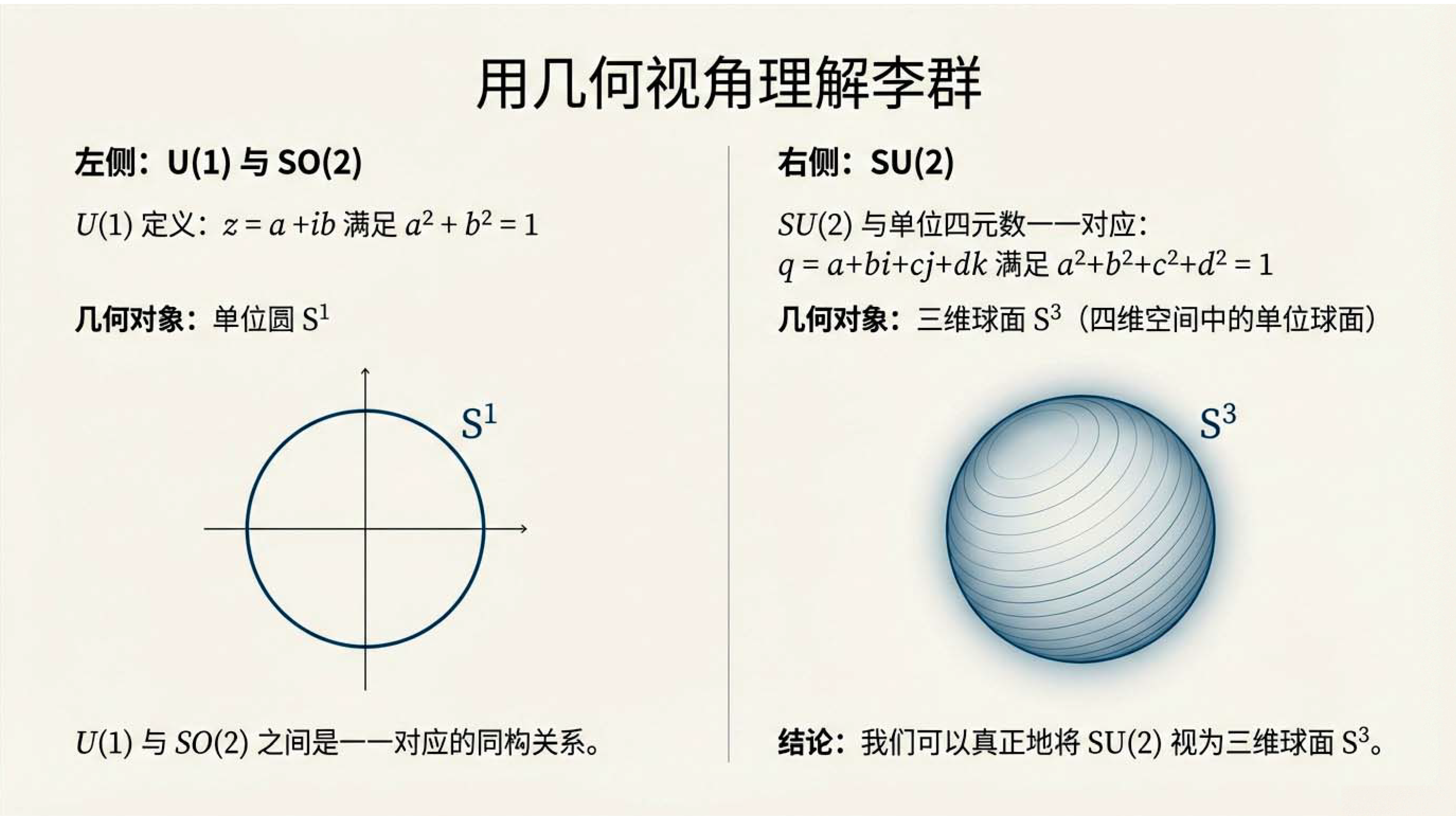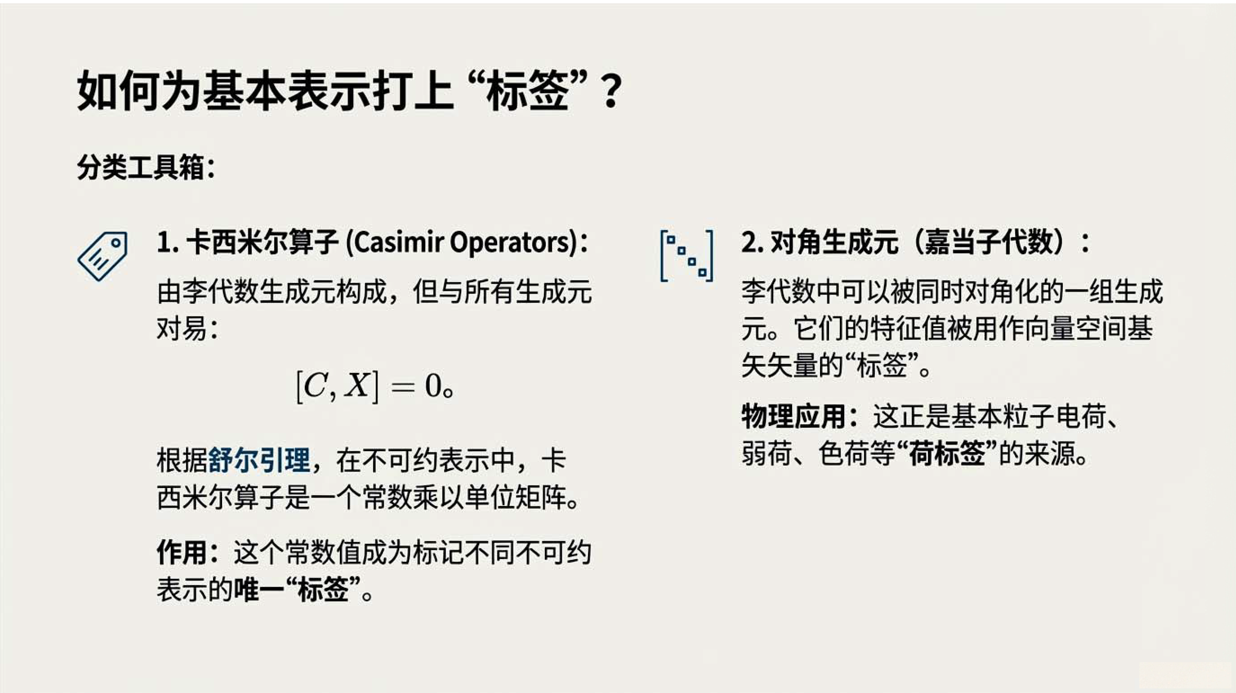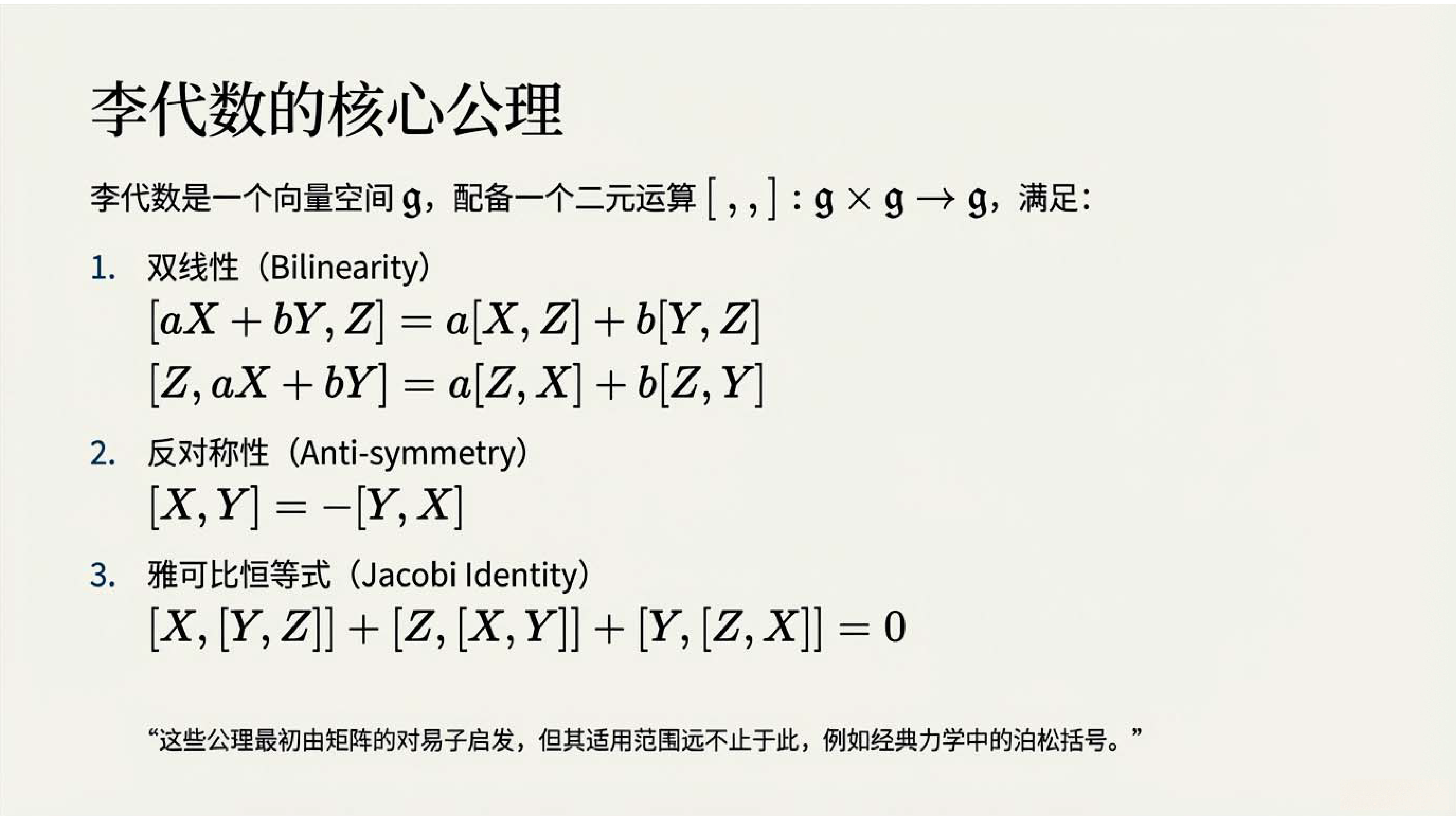 第8课视频的主要内容:阐述了李代数的抽象公理,并通过推导证明 SU(2) 生成元具有厄米无迹性质。课程强调 SU(2) 作为单连通流形,是 SO(3) 的特有覆盖群。此外,本课引入了表示论,探讨了如何利用不可约表示、不变子空间及舒尔引理来构建和标记物理系统的数学描述。