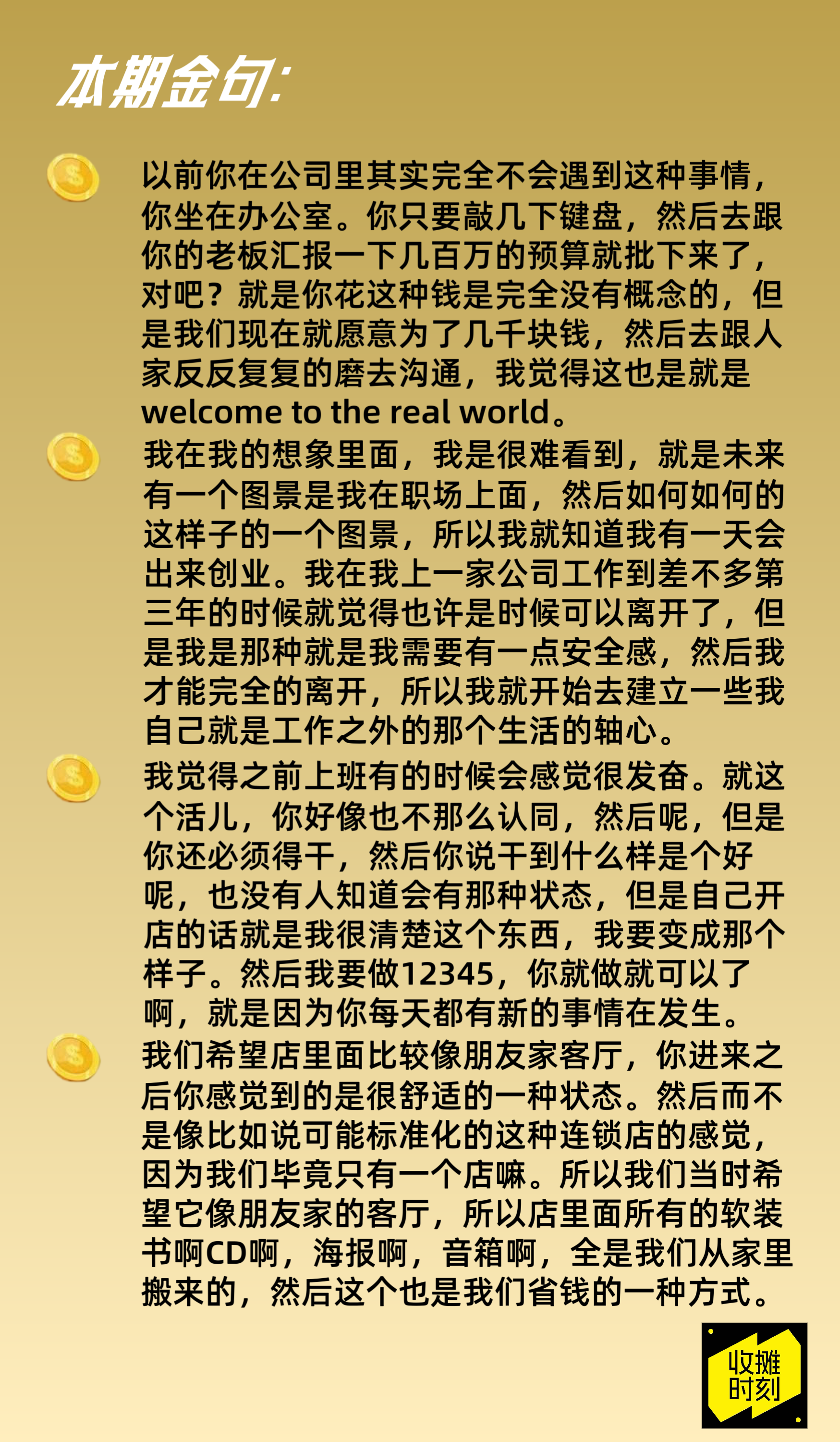 《收摊时刻》是一档主要围绕开店的搞钱经历复盘节目,钻研如何开源节流,优化盈利结构,吸取各行各业嘉宾的经验。每一个生意都需要在收摊以后进行反思,整理好状态再迎接新一天的营业。