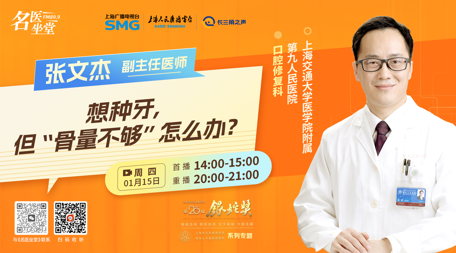 本期节目,为您邀请到第20届“银蛇奖”二等奖获得者、上海交通大学医学院附属第九人民医院口腔修复科 张文杰 副主任医师,和您聊聊“想种牙,但‘骨量不够’怎么办?”。