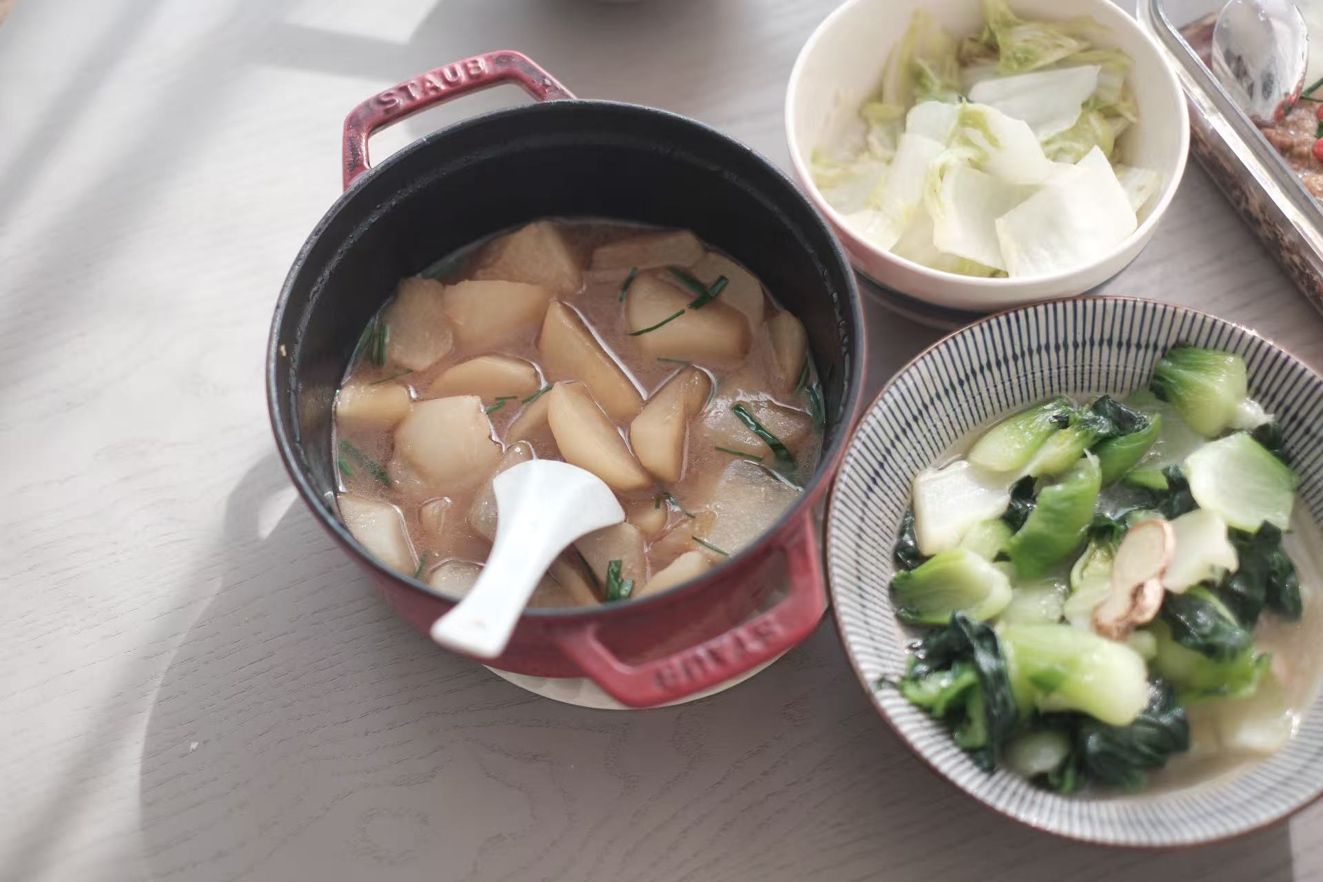 - 珐琅锅内加油,下锅翻炒,加酱油,翻炒到上色,白萝卜表面软化,加水没过白萝卜块,焖煮15-20分钟。