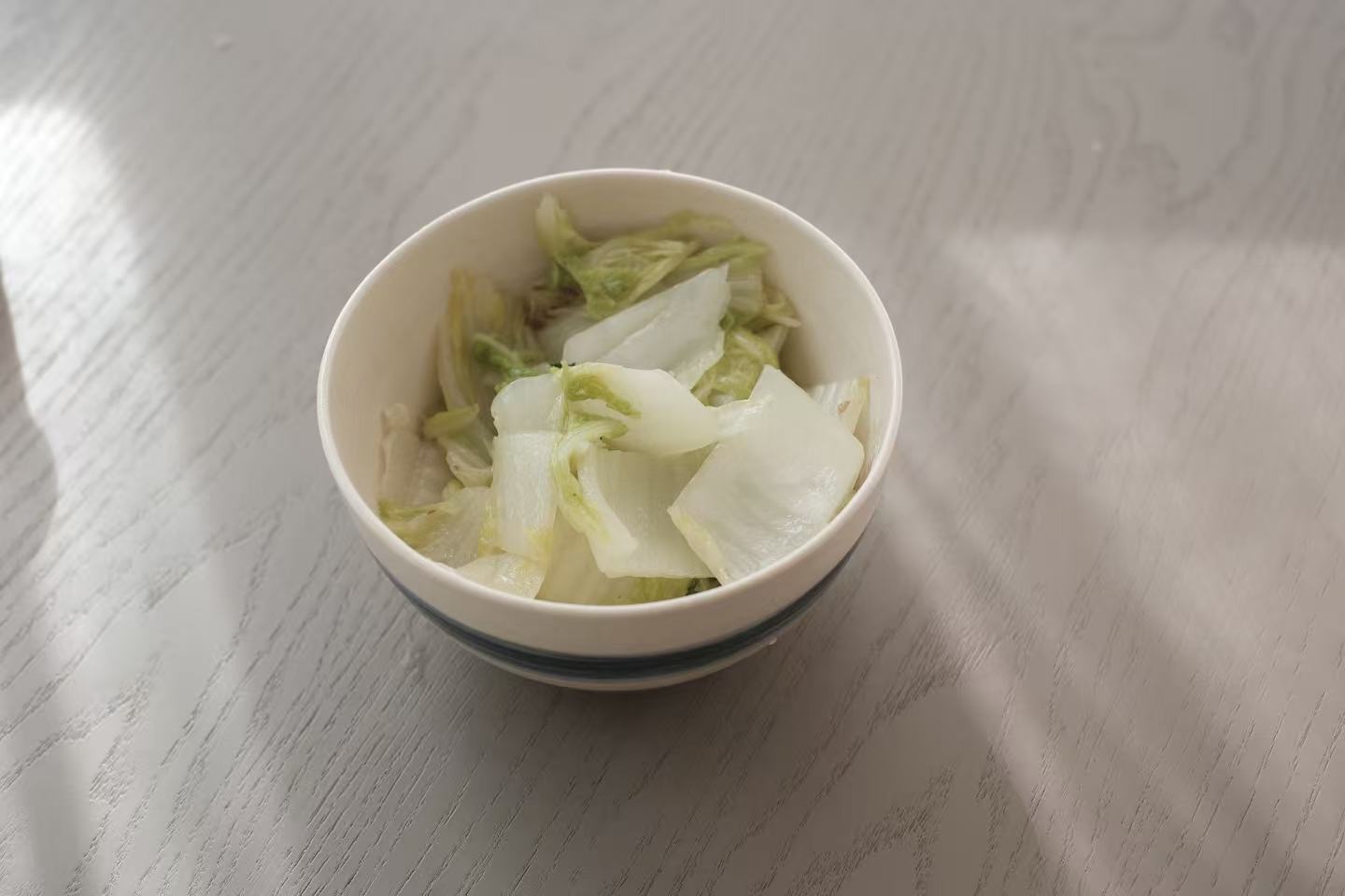 - 先炒根茎,由于白菜根茎内含大量水分,加菜叶,如果水分足够,无需额外加水,焖煮几分钟,加盐。