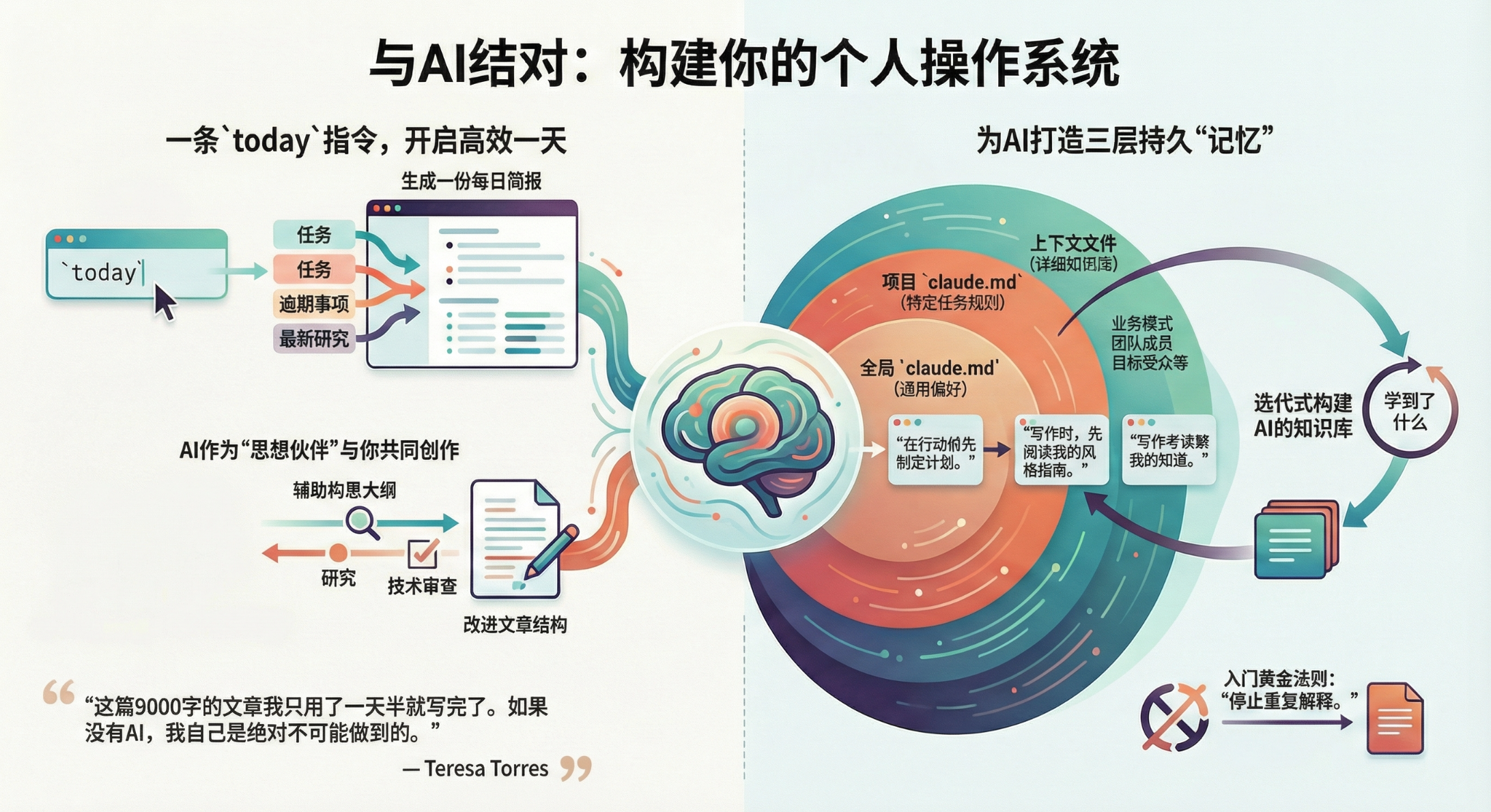 你是否曾幻想过一个永不遗忘、主动为你检索信息、并能帮你完成大部分“杂活”的智能工作伙伴?产品专家 Teresa Torres 将这种幻想变成了现实。她不是通过复杂的编程,而是巧妙地利用 Claude Code、Obsidian 笔记和一套精密的“三层上下文”系统,构建了自己的“个人操作系统”。这期内容将为你完整拆解这套系统:你将看到 AI 如何自动同步待办事项、每日检索前沿论文,以及最核心的——如何通过三层精细的上下文管理,让 AI 在长篇协作中始终保持“聪明”和“懂你”。无论你是希望提升生产力的知识工作者,还是对 AI 深度应用感兴趣的实践者,Teresa 的方法都将为你提供一套可直接复用的高阶人机协作范式。