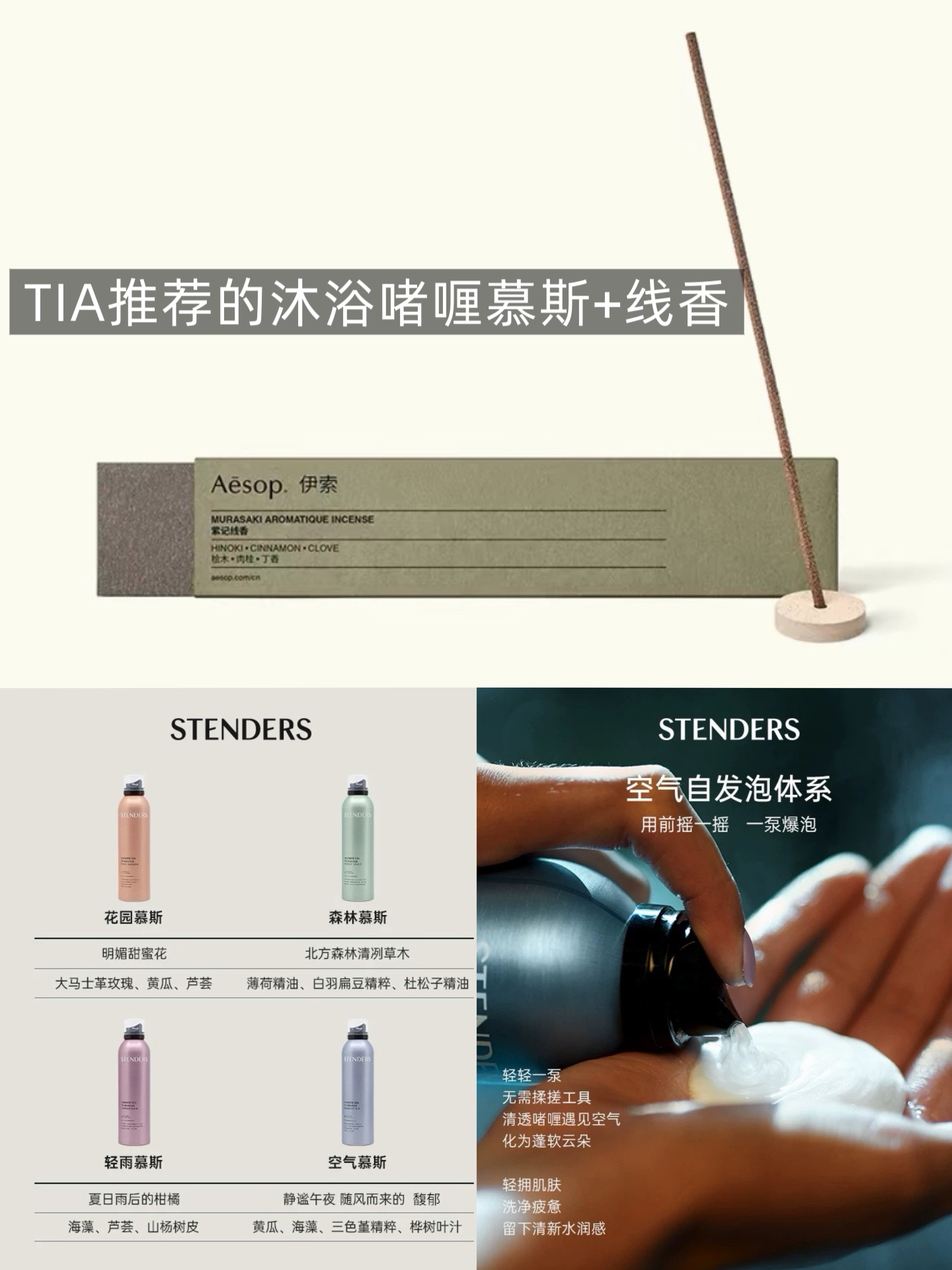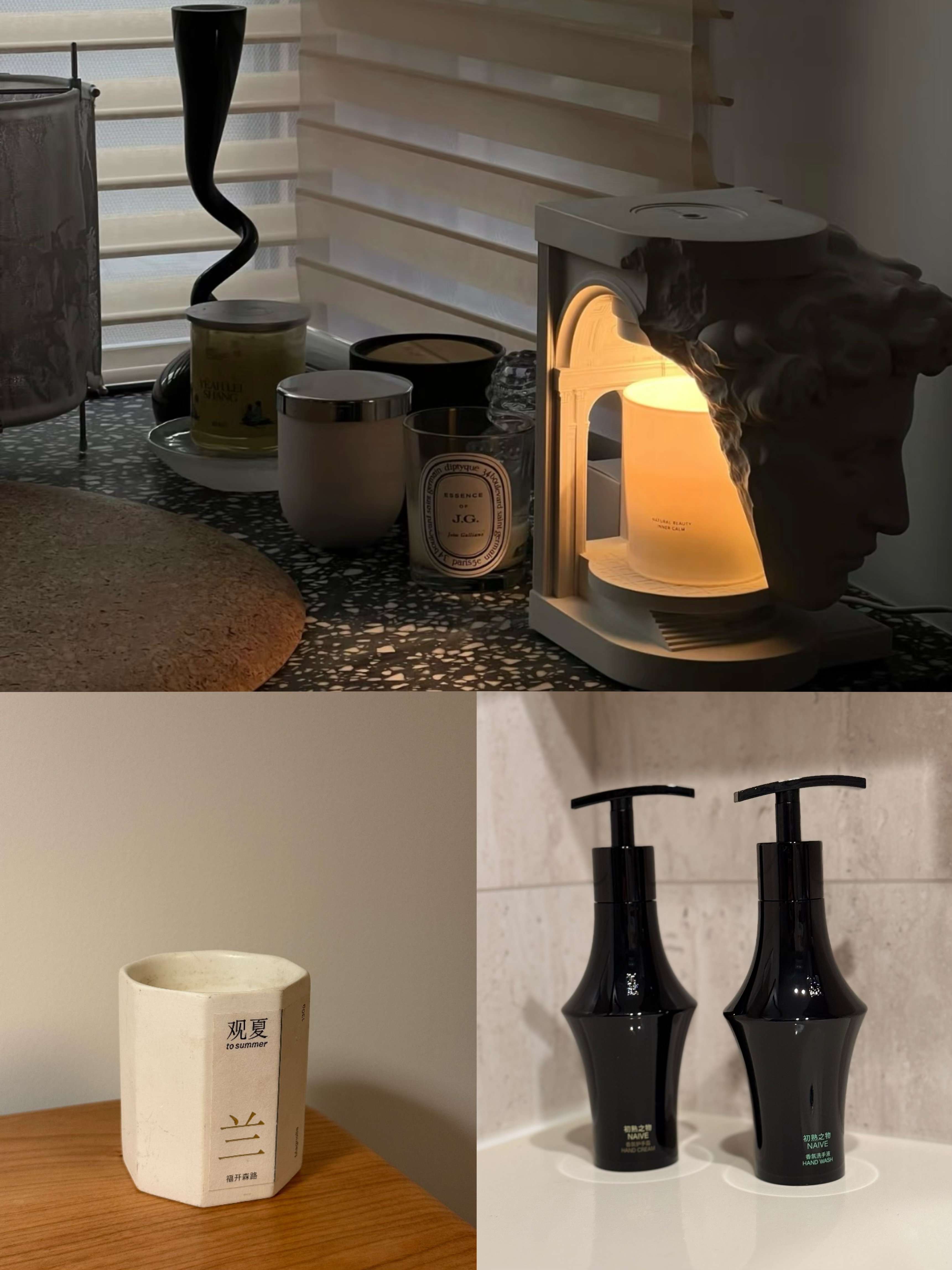 上:小鹿推荐的融蜡灯;下左:Jason推荐的「观夏」香薰;下右:Jason推荐的「闻献」洗护产品