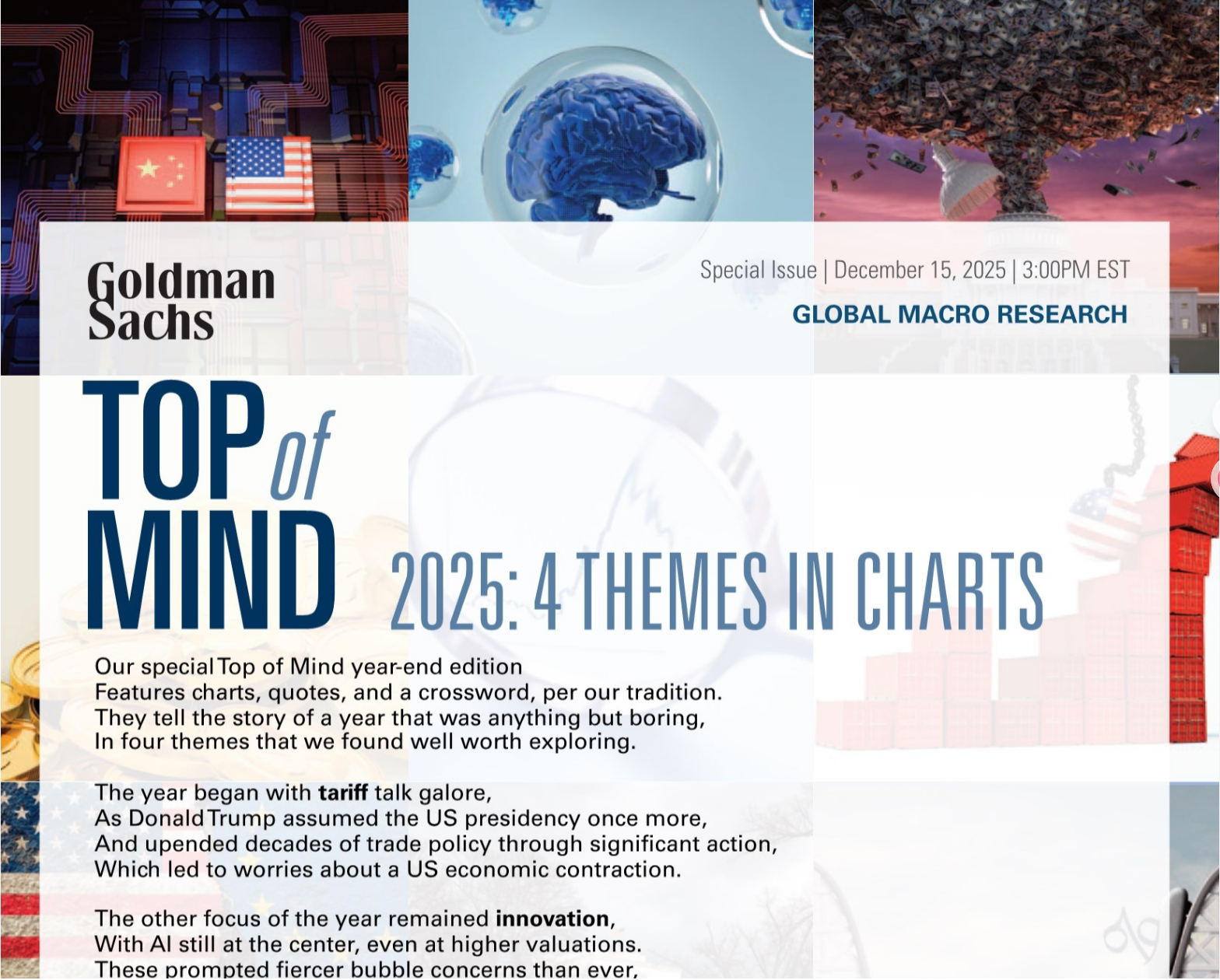 2025年搅动全球经济的,不是单一热点,而是贸易政策反转、AI泡沫争议、机构信任危机、地缘博弈升级这四大主题。这份来自高盛12月15日发布的《2025:四大主题图表解析》特别报告,用硬核数据和图表,揭露了全球经济的底层逻辑重构。