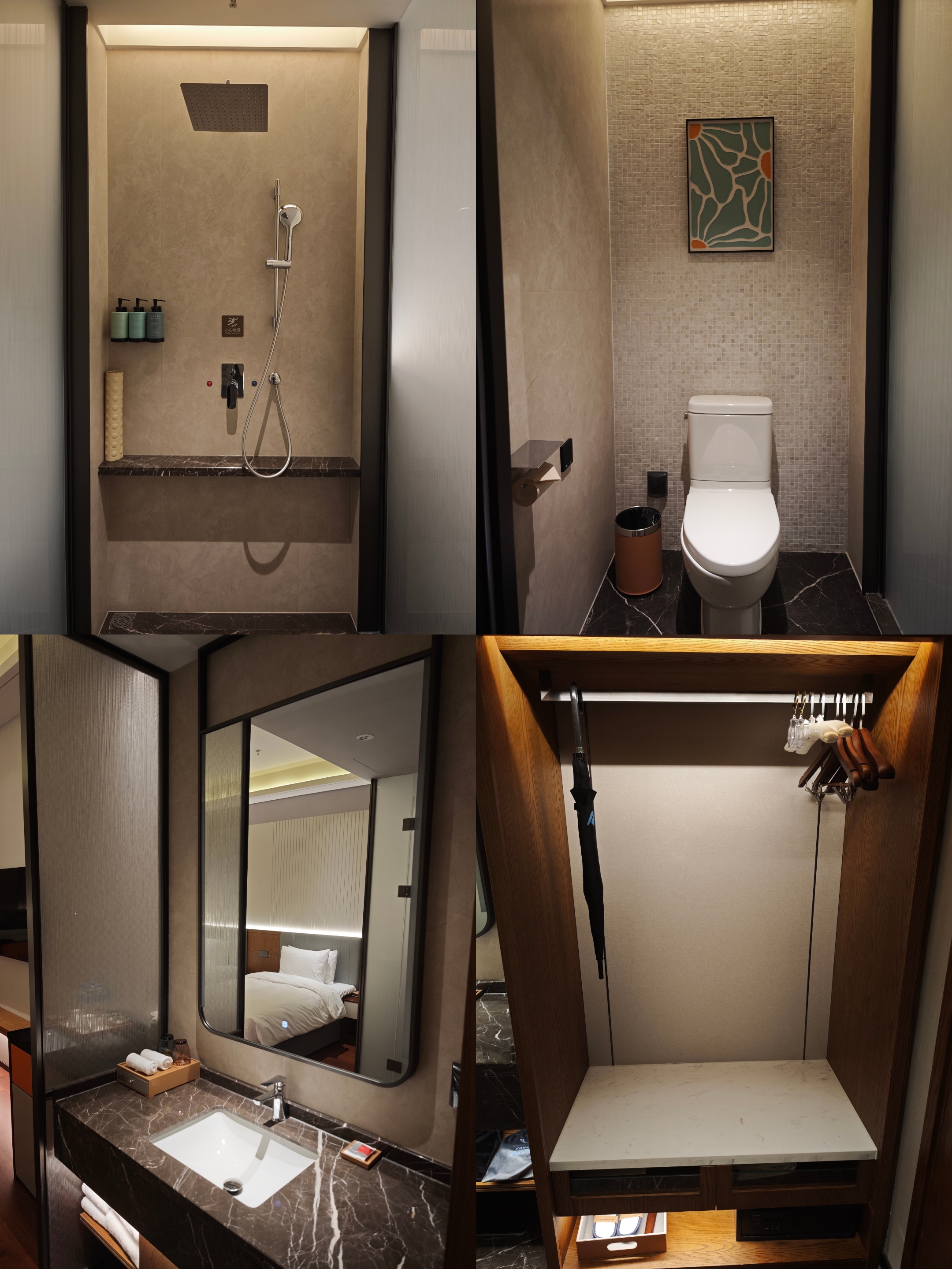 浴室是干湿分离设计,大理石台面干净到反光,DEEP NATURE的洗护套装香气清新,洗完头发蓬松又柔顺。拖鞋软乎乎的像踩在云朵上,连毛巾都叠得像艺术品,细节控直接爱住。