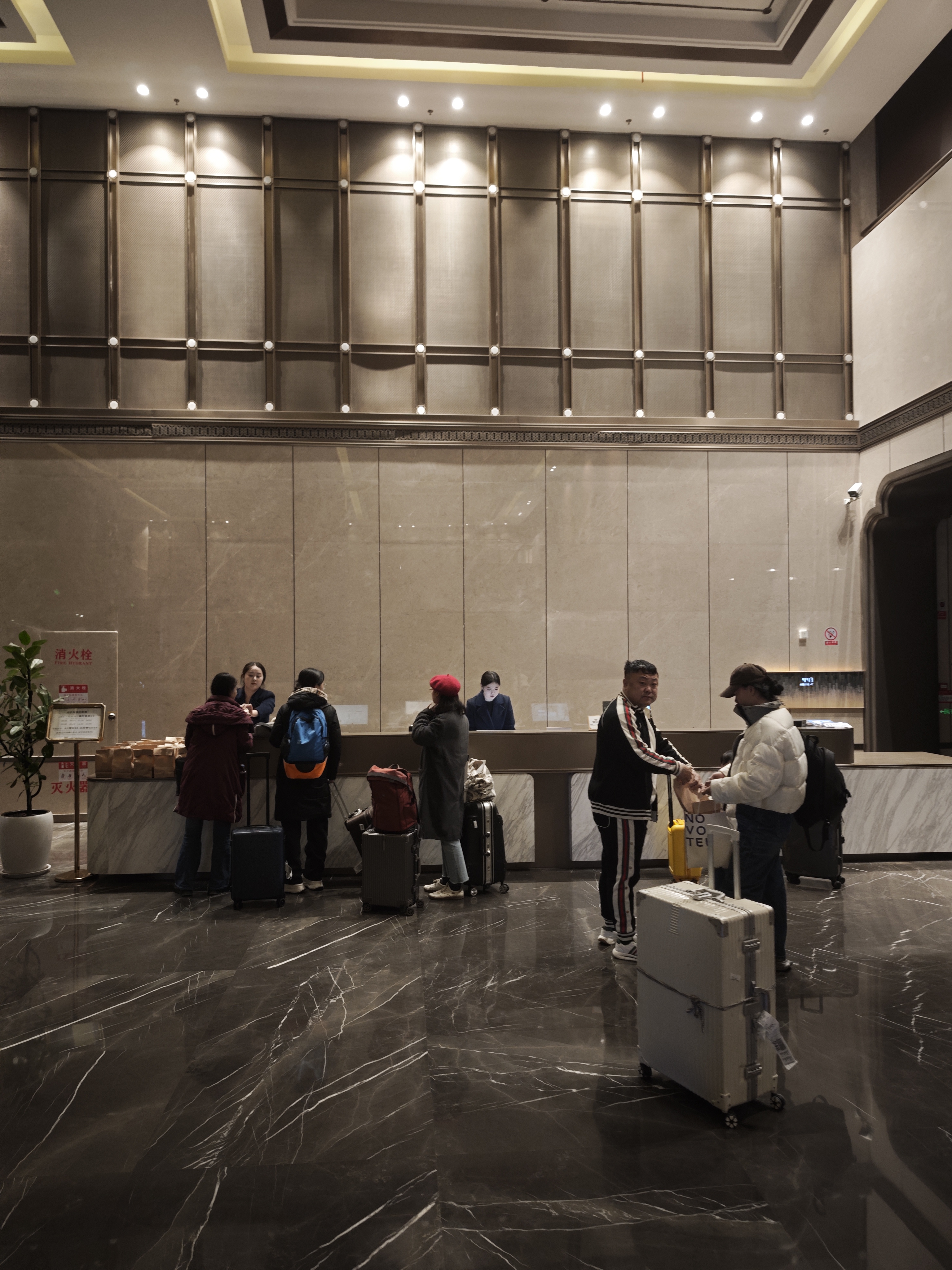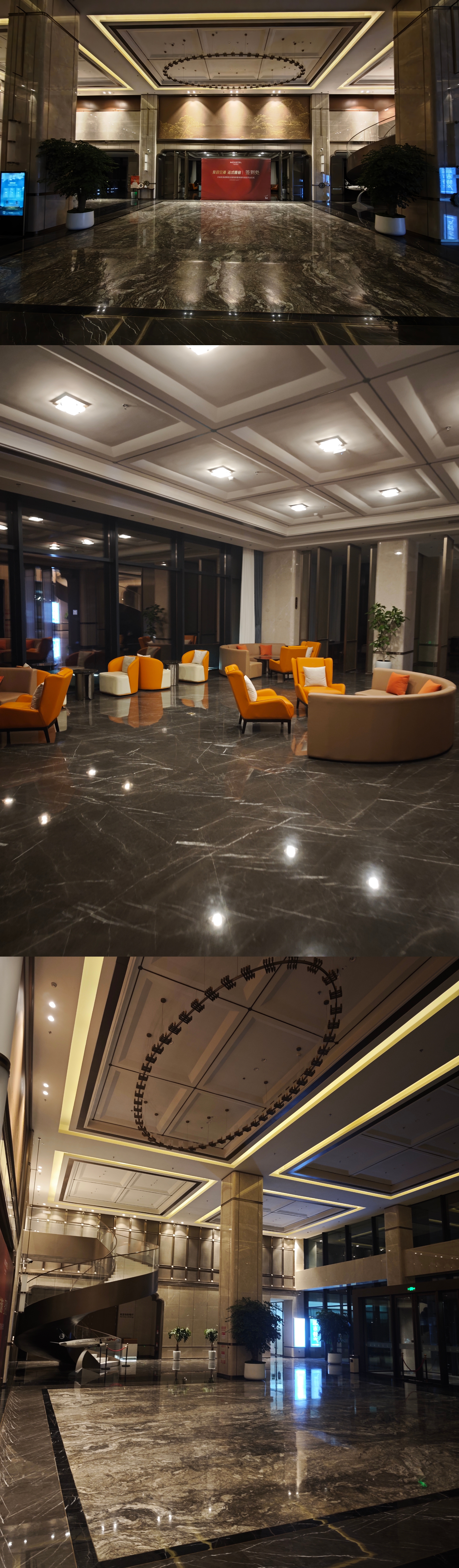 刚到酒店门口,通透的玻璃大门配上暖金色灯光,高级感直接拉满。走进大堂,深灰色大理石地面光可鉴人,橙色沙发像小太阳一样点亮整个休息区,奔波的疲惫瞬间被治愈。