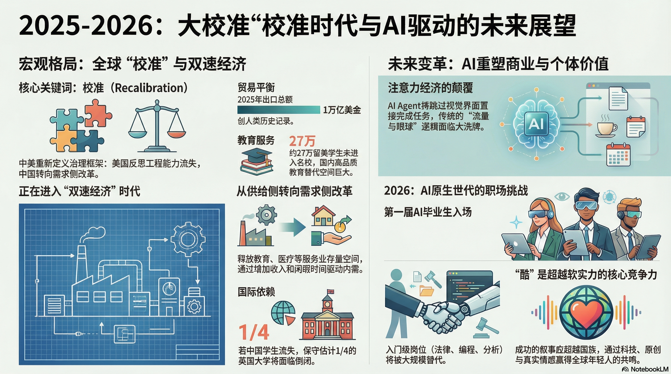 本期播客以“校准”为核心关键词,深入探讨了中美在“工程思维”与“律师思维”下的竞争差异、AI带来的“双速经济”冲击、消费市场从增量到存量的转型,以及个体在AI时代如何通过构建“第二大脑”来保持独特的创造力。