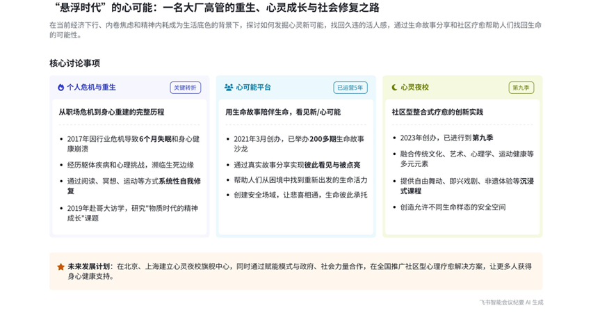 本章节主要围绕“心可能”与“心灵夜校”的未来发展方向展开。剑雄表示正与共创伙伴共创未来走向,心灵夜校方向将有转变,会在北京、上海等城市做社区美好中心,在原有基础上提升服务,希望项目后续成为赋能型项目,联动政府、社会、社区力量服务更多人。与此同时,“心可能”未来将持续关注人,进行深度滋养、链接与共创。