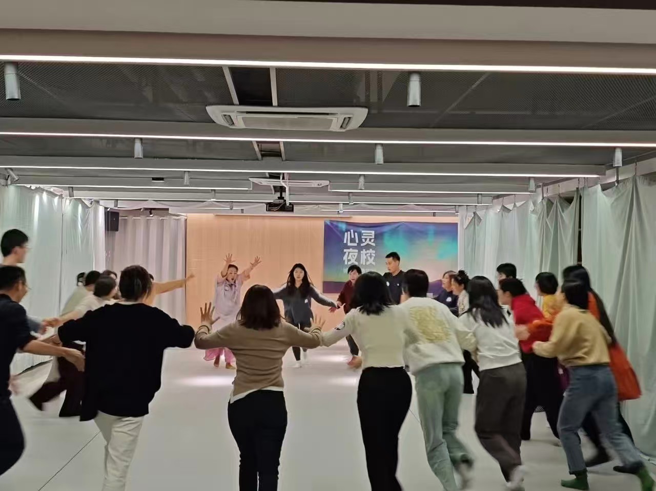 “心灵夜校”:提供沉浸式、体验式身心整合课程,包括自由舞动、即兴戏剧、非遗等课程,将传统文化、艺术与审美、心理学、运动健康等多方面内容整合。参与者在体验课程中获得身心疗愈和成长。