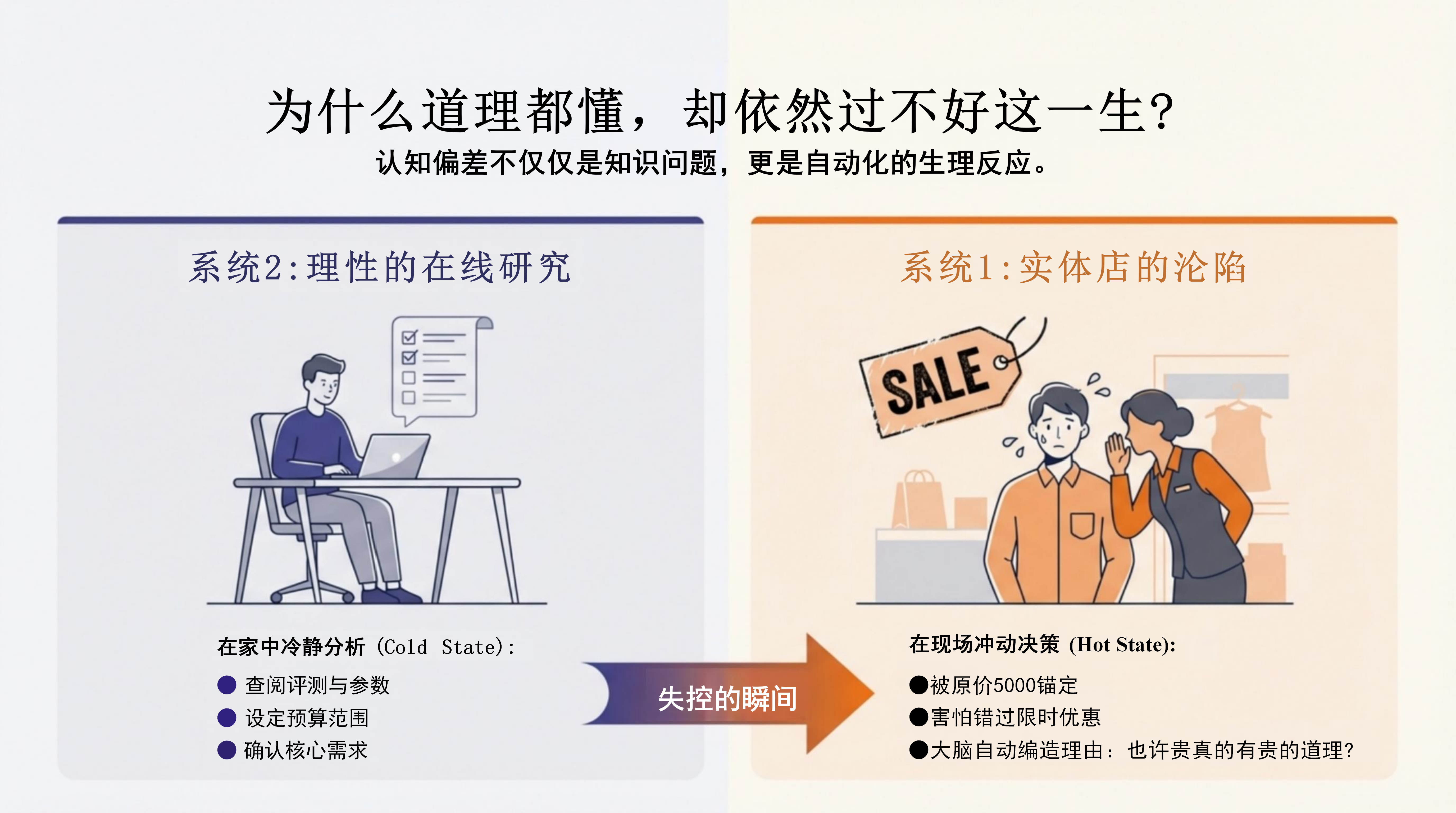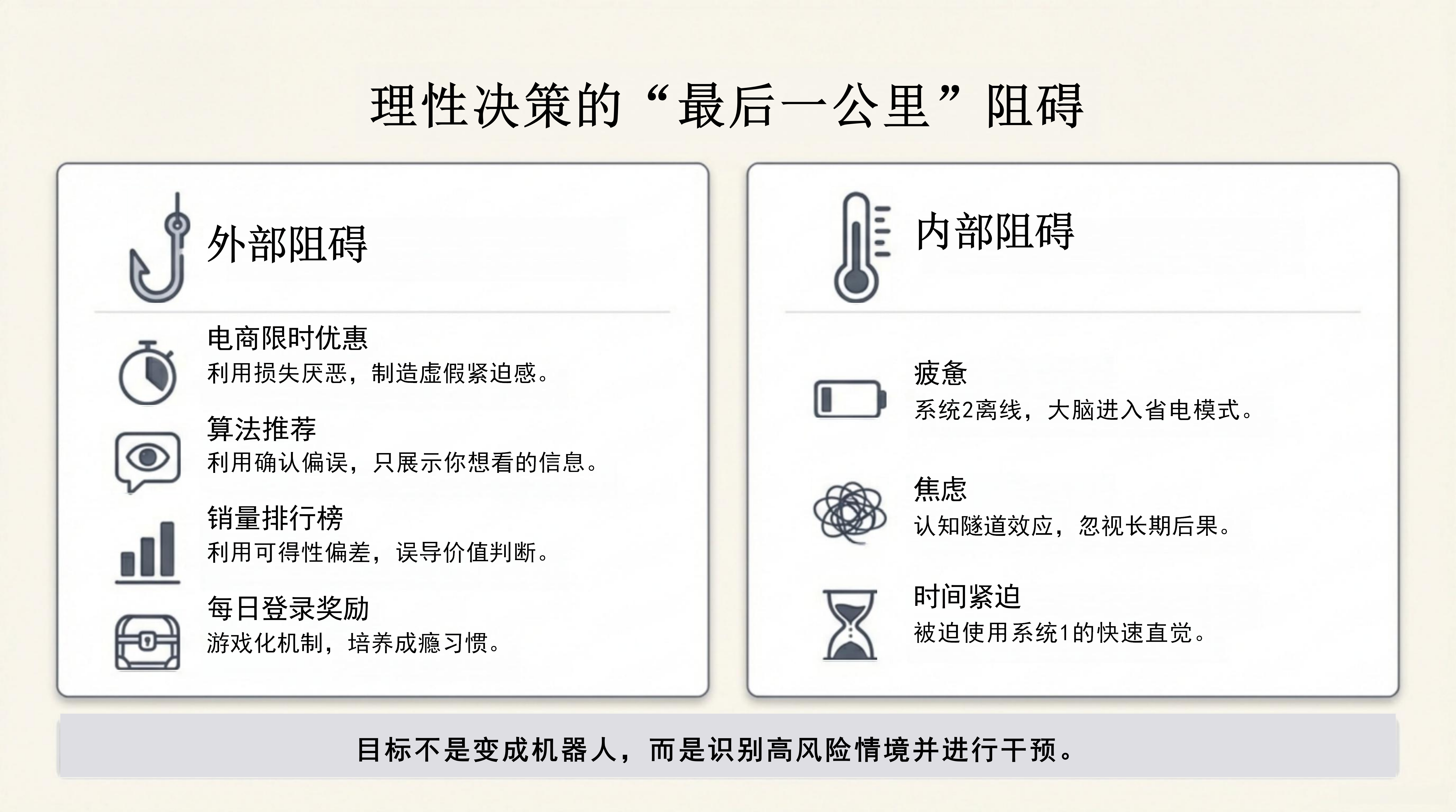 核心挑战在于系统1是默认的运行模式。即使个体在理智上意识到认知偏差的存在,系统1的自动影响仍然会在当下左右其判断。此外,系统1还非常擅长为直觉决策编造看似合理的理由,使其错误难以察觉。