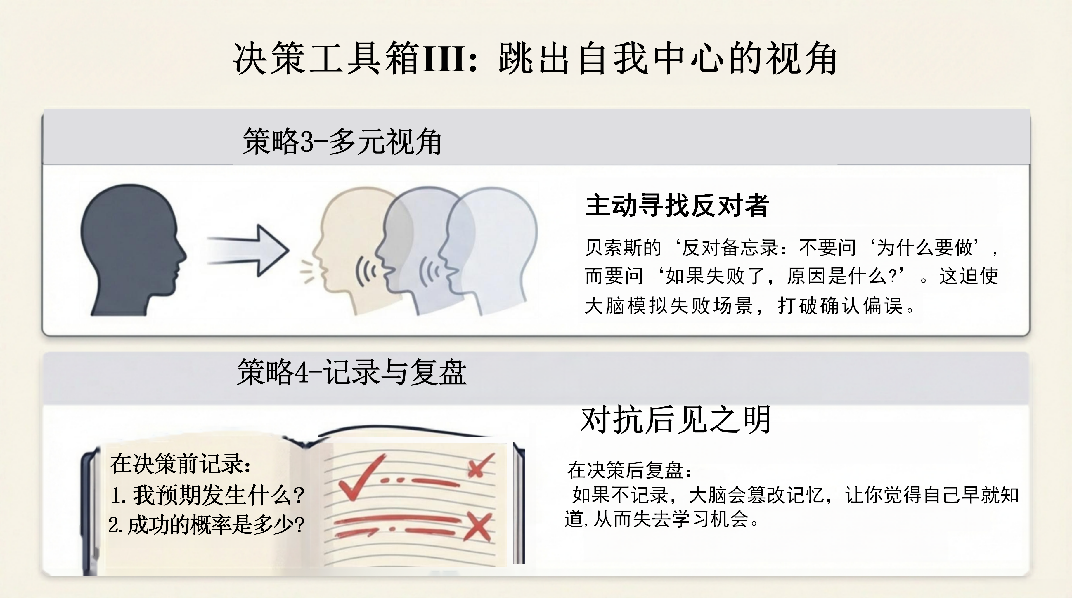 •应用:在最终确定一项重要决策之前,咨询那些值得信赖、以提供诚实且具有批判性反馈而非简单附和而闻名的人。一个值得提出的问题可能是:“如果这个决策最终被证明是错误的,最可能的原因是什么?”这种方法类似于杰夫·贝佐斯在亚马逊推行的“异议备忘录”做法,通过确保决策经受住了审查,从而增强了最终决策的可靠性。