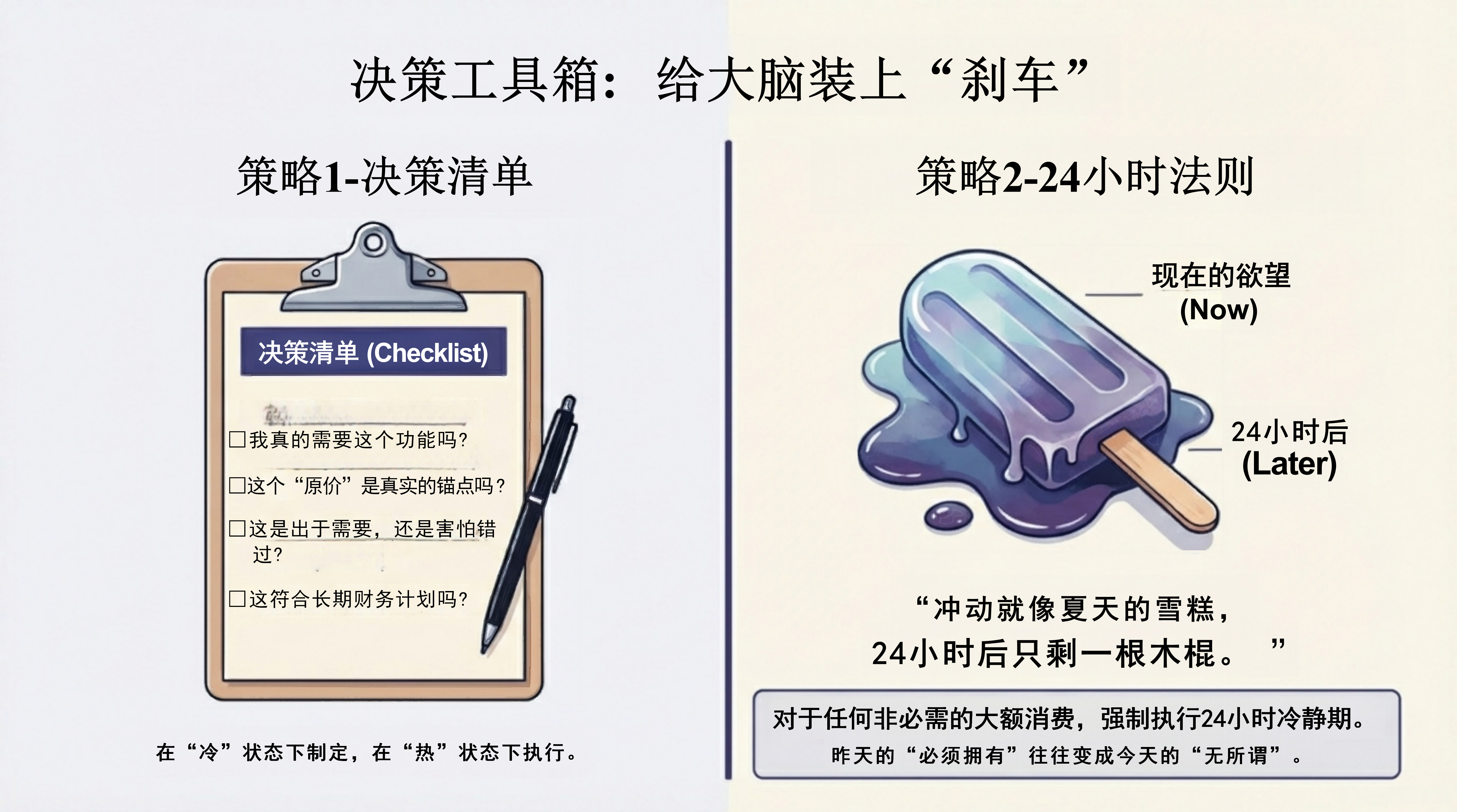 •应用:对于因“限时”优惠而产生的大额消费,自我设定24小时冷静期可以揭示最初的紧迫感是否只是人为造成的。对于因愤怒或沮丧而做出的情绪化决定(例如辞职、结束一段感情),停下来“仔细考虑”可以避免做出影响人生的错误。