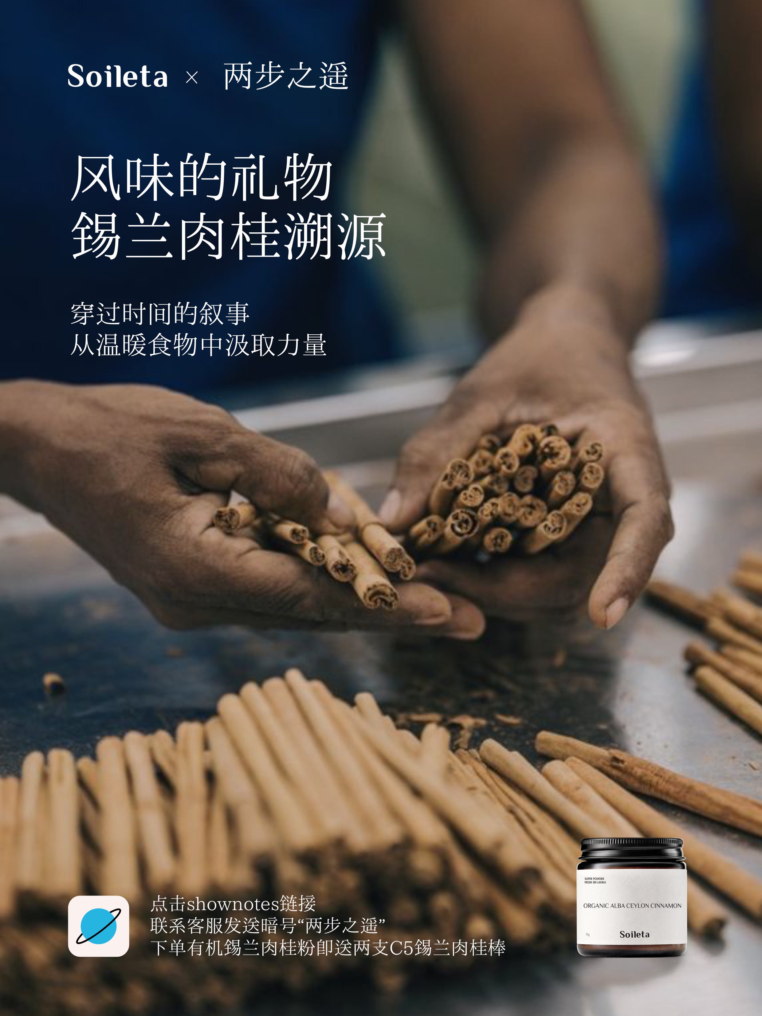 感谢Soileta对于两步之遥的大力支持,也很开心可以在谈及Soileta的锡兰肉桂溯源之旅时,能用上Soileta在斯里兰卡的雨林中实地采风的曲子,浓郁的红土、热带季风、香料的气味随之扑面而来,让我们能一起借着声音穿过时间的叙事,从温暖食物中汲取力量。