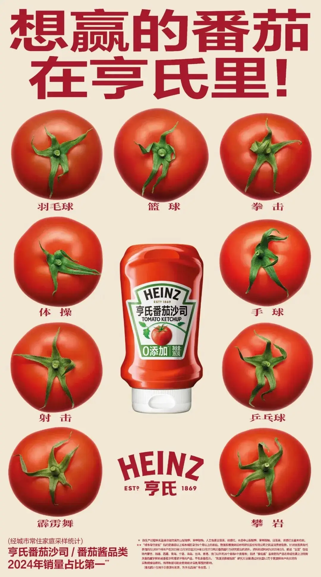 - 赛事营销:创意激活品牌热度:全运会期间,亨氏跳出传统广告思维,设计 34 个形态各异的巨型番茄海报,将番茄蒂绿叶子转化为举重、跳水等运动形象,在广州地铁形成刷屏效应。这种将品牌元素与热点事件创意结合的方式,既打破了传统媒体无用论的偏见,又强化了 “番茄” 这一核心品类的记忆点。
