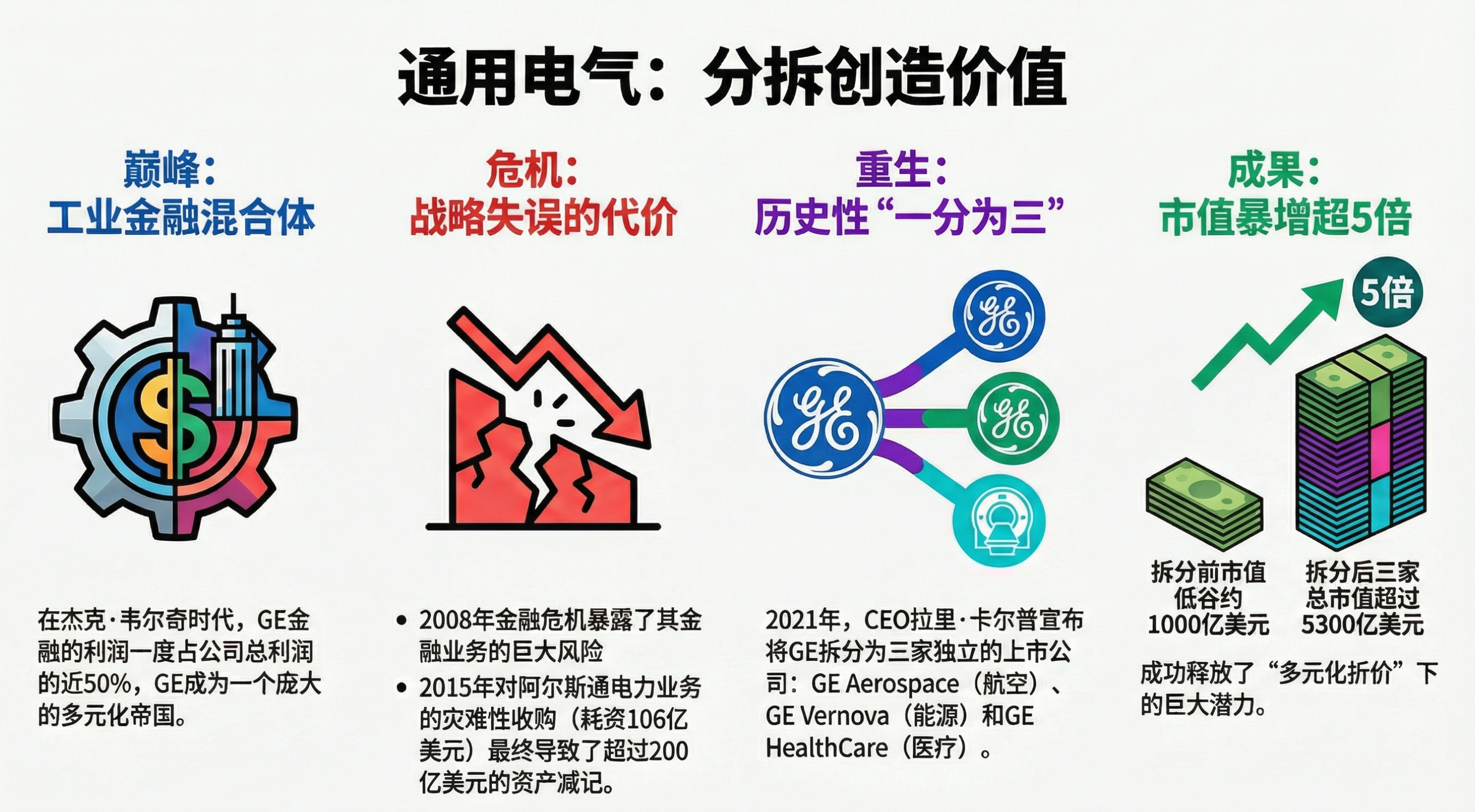 - 核心议题:卡尔普最终决定将GE拆分为三家独立的上市公司,以消除“多元化折价”,释放各业务的真实价值。