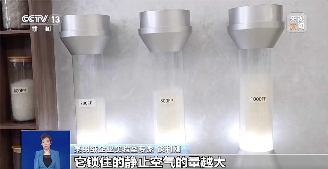 - “蓬松度”指的是30克羽绒在标准压力下的体积,蓬松度越高,羽绒锁住的静止空气的量越大,衣服的保暖性能也就相对越好。