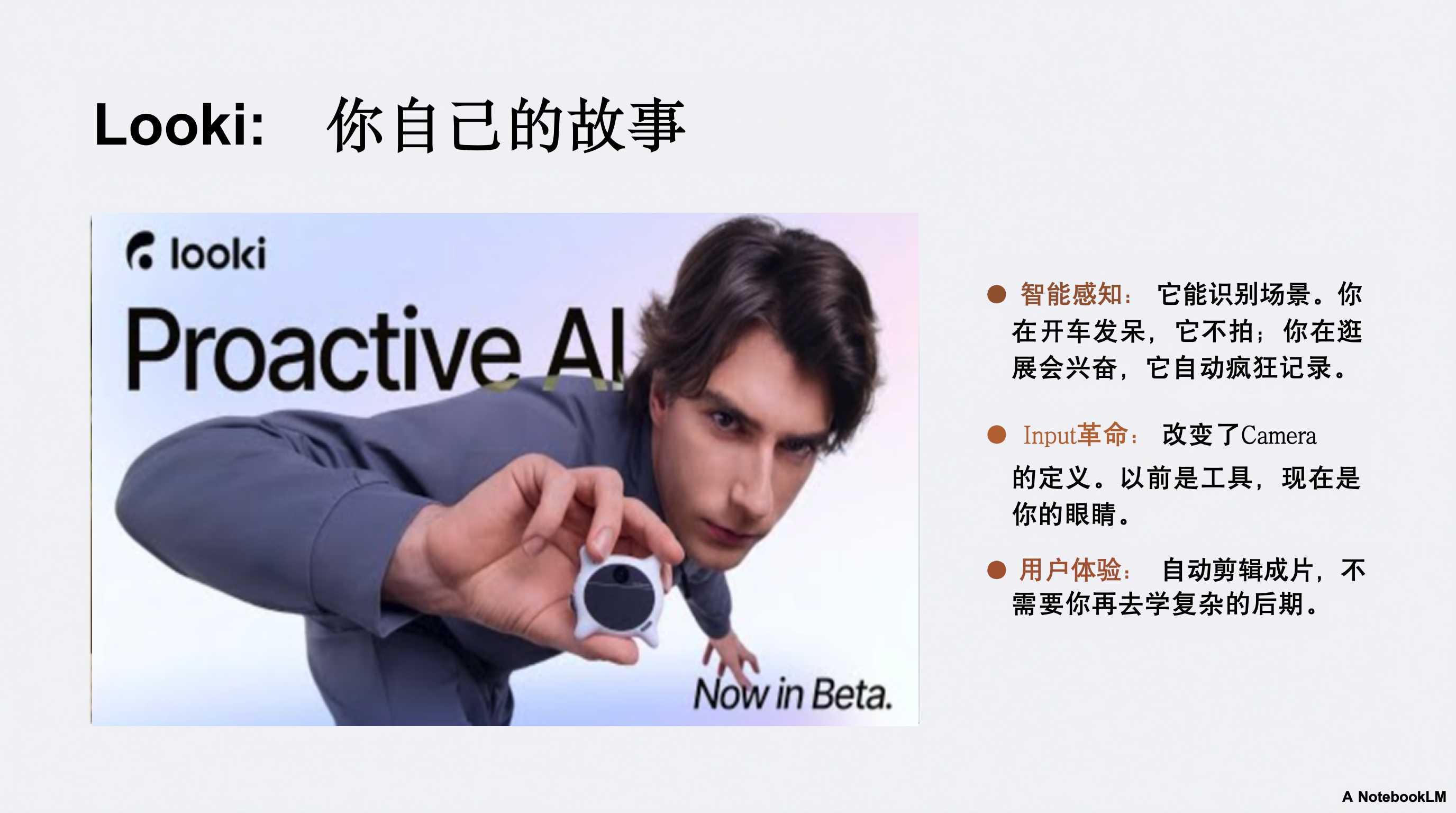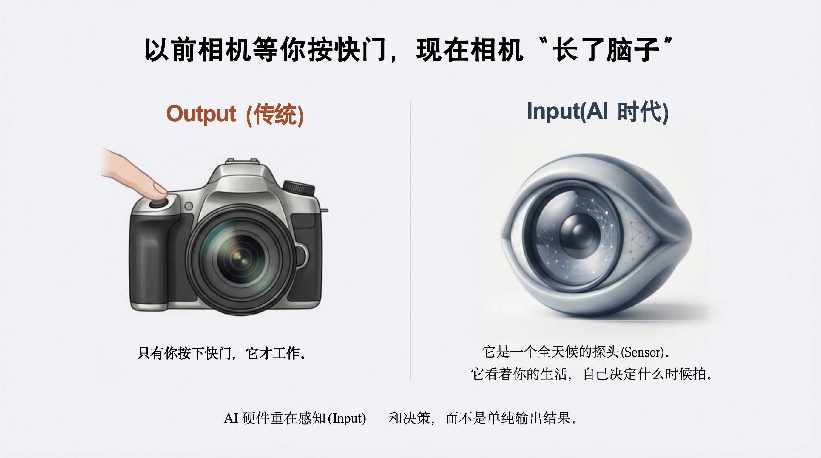- 06:17 核心产品观:Input vs Output:探讨 Loki 创始人提出的理念——上一代设备(如相机)是为了输出结果(Output),而 AI 硬件更像是一个探头,核心在于对环境的感知与输入(Input) 。