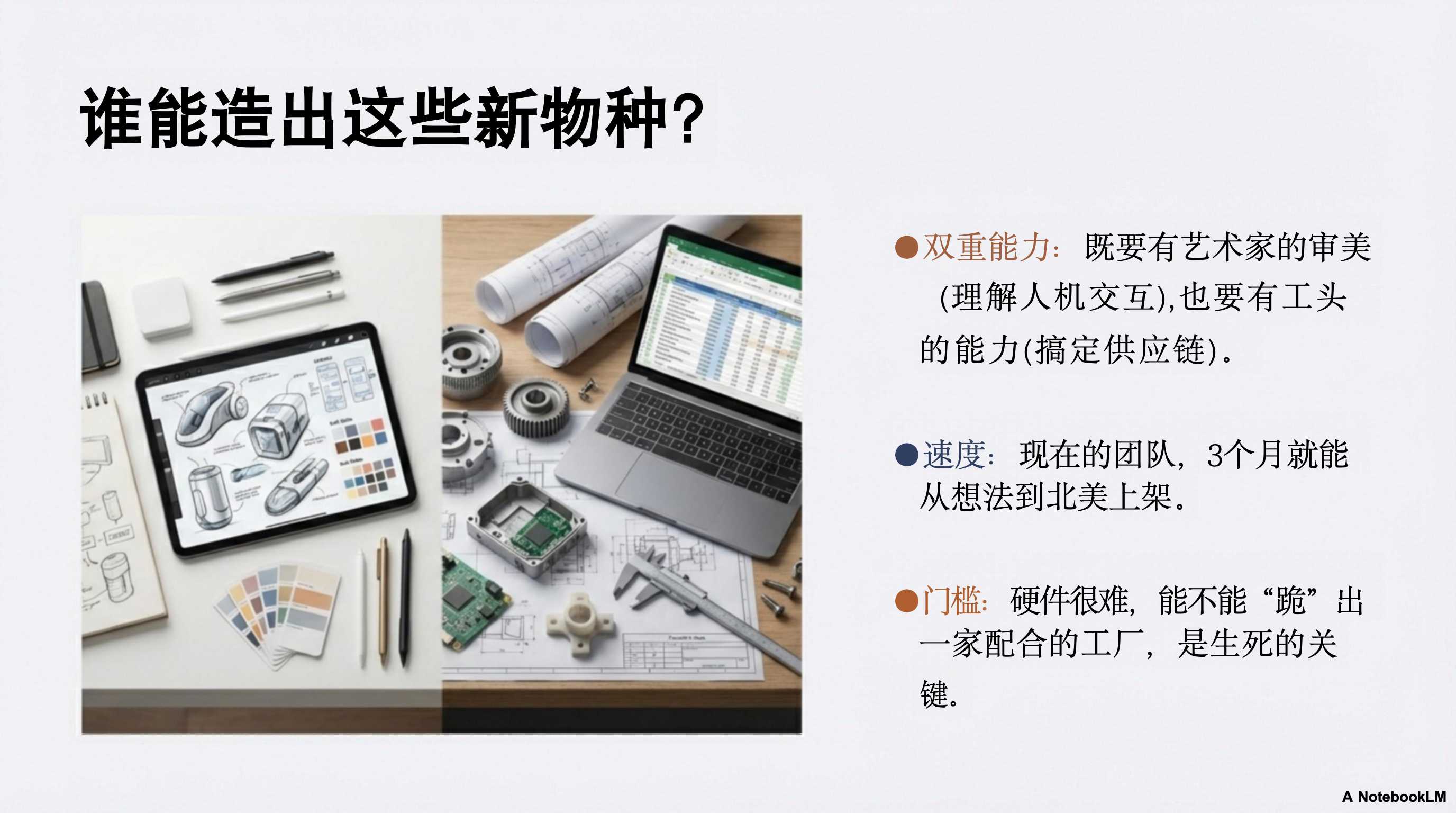 - 38:52 AI 硬件团队的新画像:不一定需要传统硬件背景,但必须对“人与 AI 的交互”有原生且深刻的理解。创始人的愿景与快速闭环能力至关重要 。