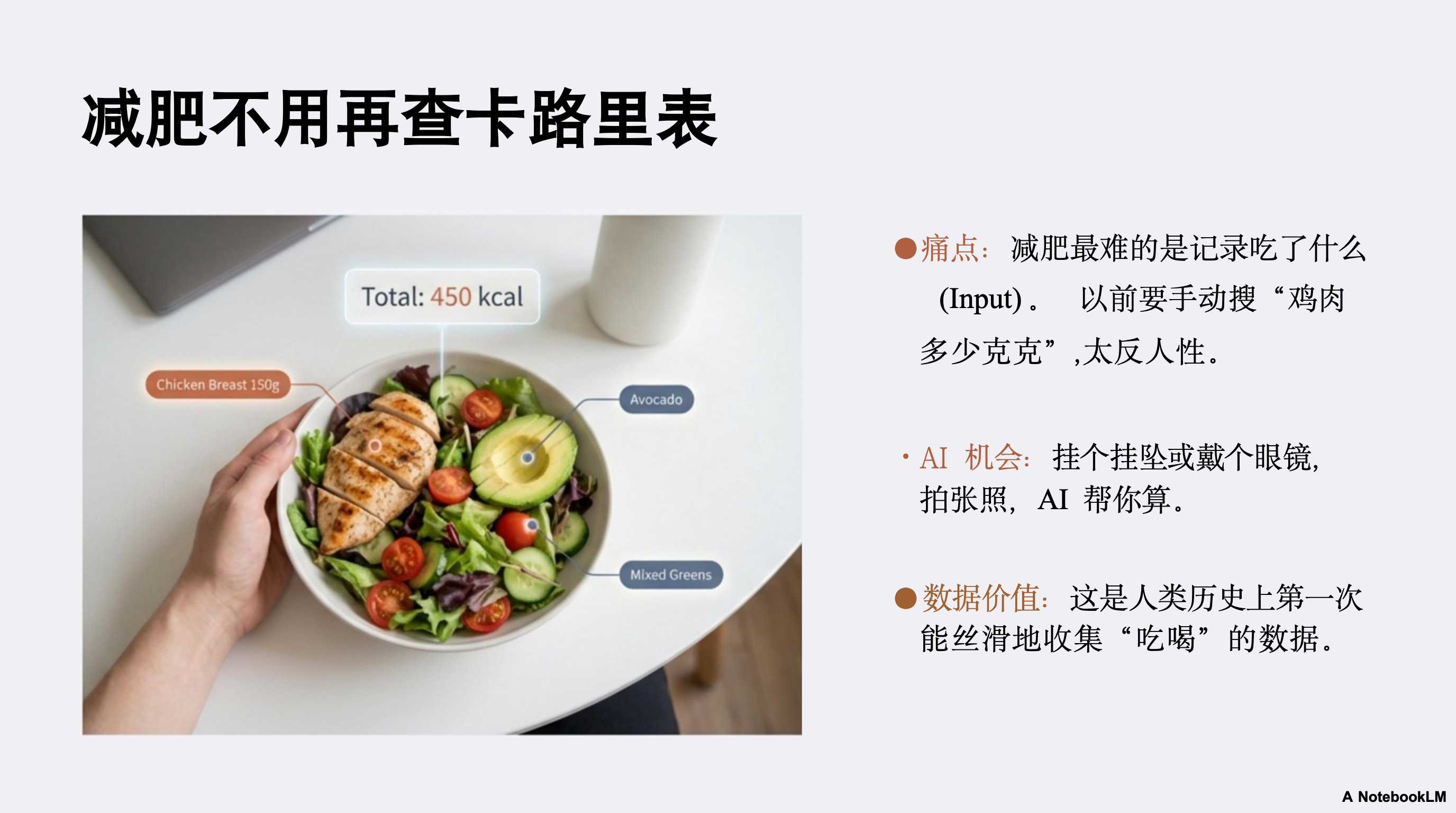 - 23:52 AI 健康的新机遇:相比于手动输入卡路里的繁琐,利用 AI 视觉识别饮食(Input)来管理健康,是一个巨大的潜在赛道 。