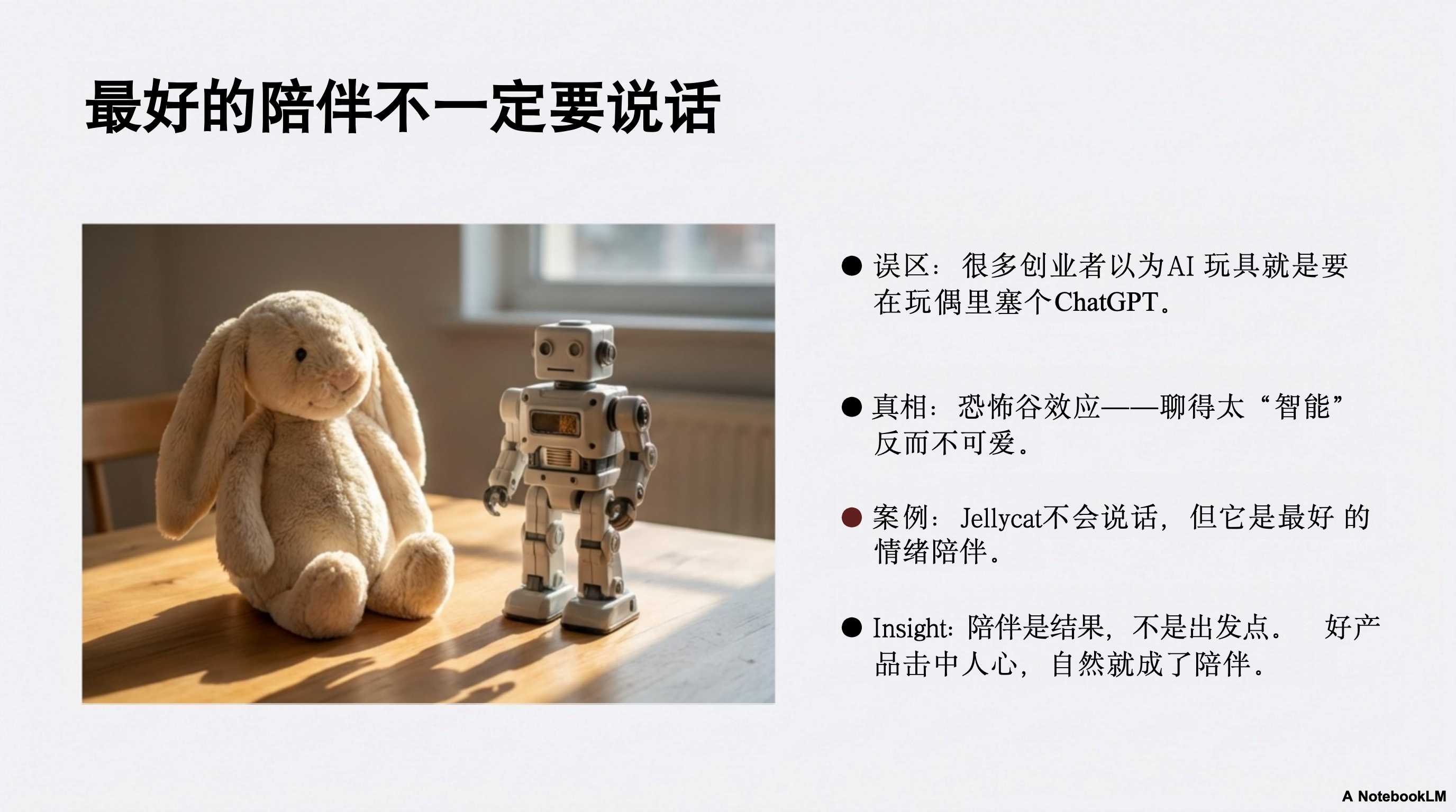 - 21:29 陪伴是结果,不是目的:好的产品不需要刻意强调“陪伴”。如果产品足够好用、建立了情感连接(如 Jellycat),陪伴感自然会产生,而不是为了陪伴而强行让它说话 。