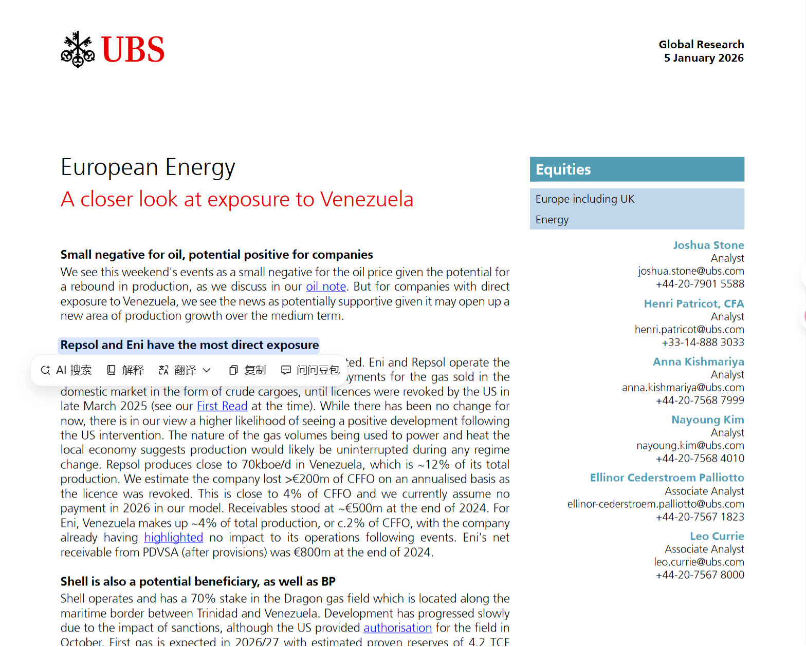 瑞银2026年1月5日发布的《European Energy:A closer look at exposure to Venezuela》明确指出,委内瑞拉相关事件对油价构成小利空,但对直接涉足委内瑞拉业务的欧洲能源企业而言,将开启中期生产增长空间,成为潜在受益群体。