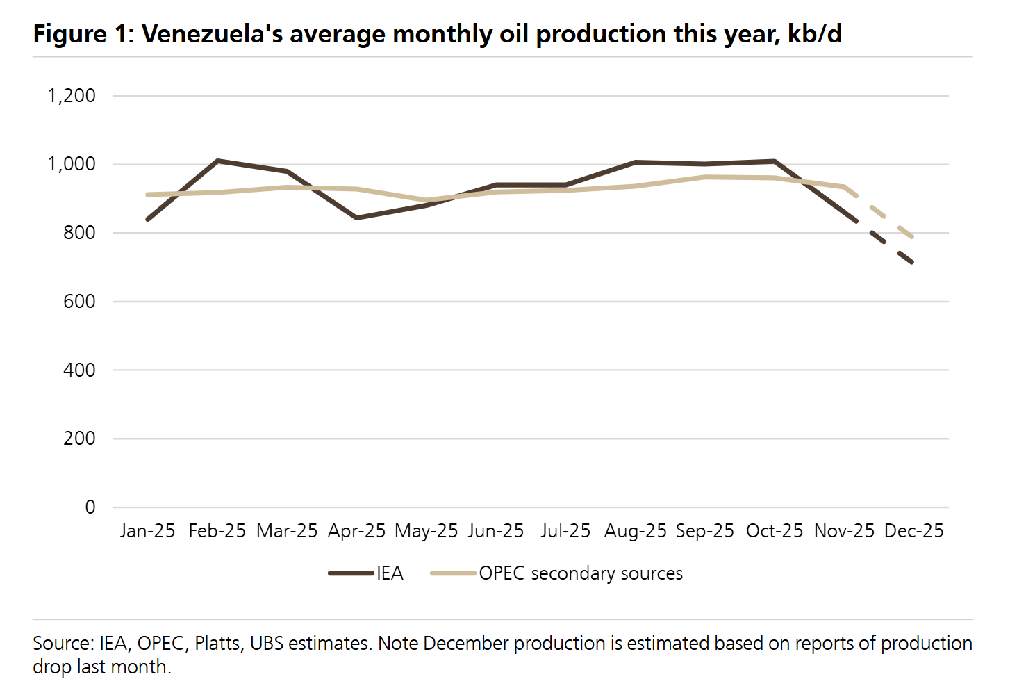 图1(研报ab2页)《2025年委内瑞拉月均石油产量》:以千桶/日为单位,展示2025年1-12月产量波动,数据源自IEA和OPEC二手信息,清晰呈现全年产量趋势,为“产量反弹”的判断提供数据支撑;