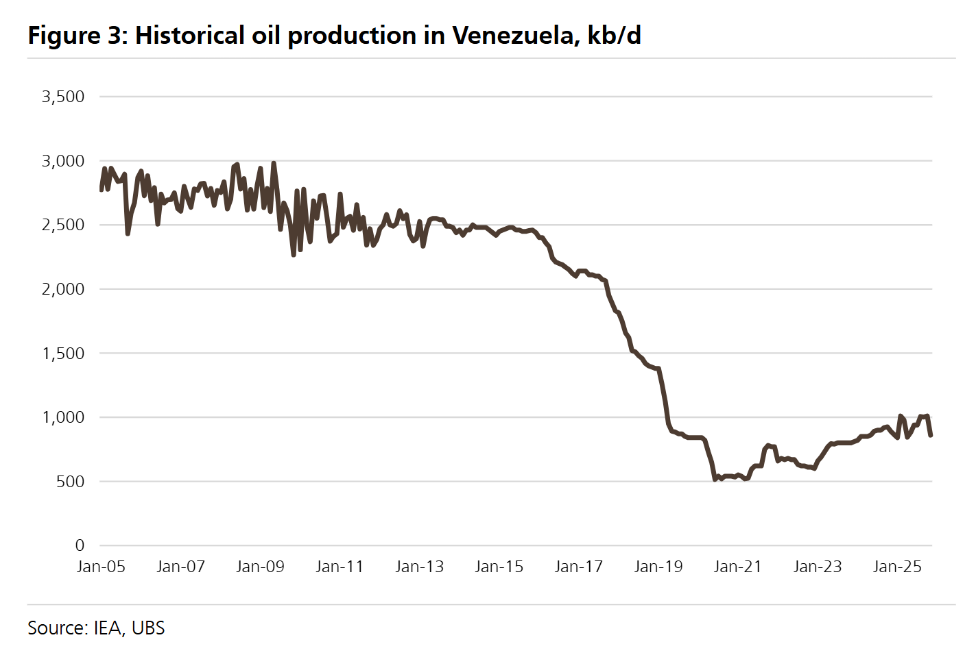 图3(研报ab3页)《委内瑞拉历史石油产量》:覆盖2005-2025年,呈现长期产量变化轨迹,凸显当前产量水平与历史峰值的差距,体现反弹空间;