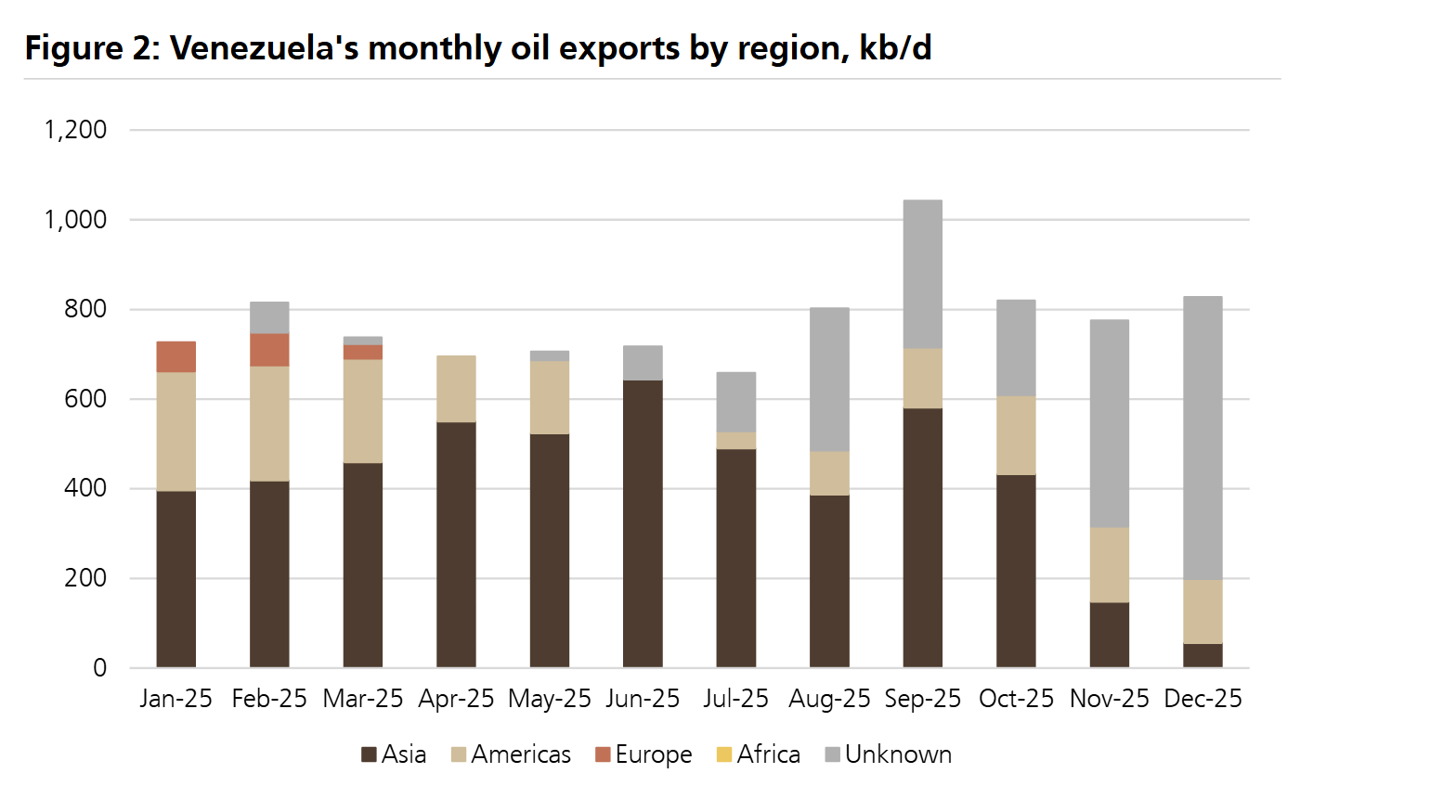 图2(研报ab2页)《2025年委内瑞拉月度石油出口按地区分布》:同样以千桶/日为单位,划分亚洲、美洲、欧洲等出口区域,反映其出口结构,帮助判断不同地区需求对产量的影响;