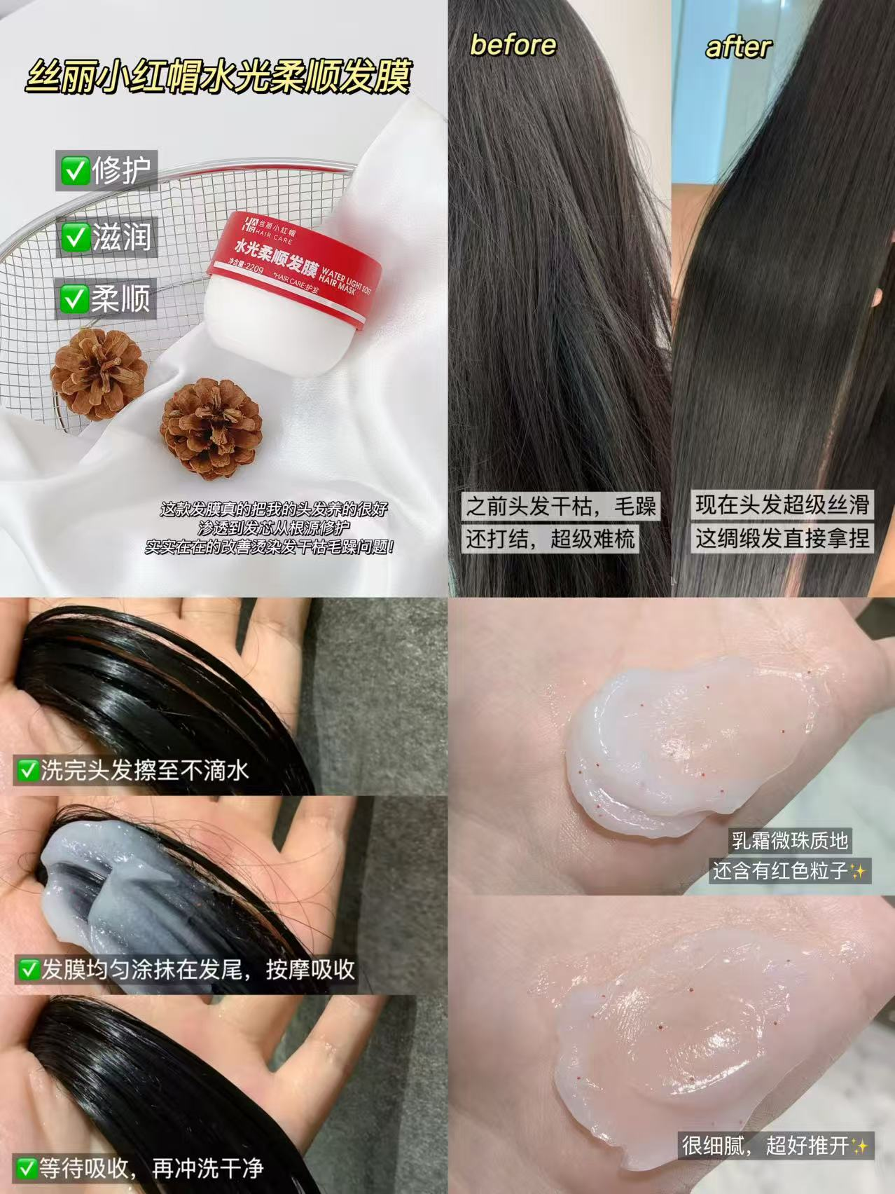 ✅ 水光柔顺发膜:华熙专利玻尿酸+山茶籽油精准灌溉发尾,梳子一梳直接打滑!不是假滑是沁进去的水光感,静电毛躁一键关机。