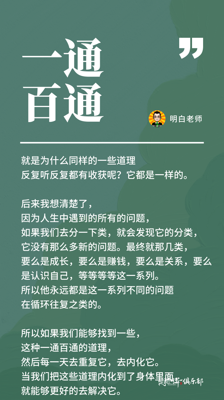 后来我想清楚了,因为人生中遇到的所有的问题,如果我们去分一下类,就会发现它的分类,它没有那么多新的问题。最终就那几类,要么是成长,要么是赚钱,要么是关系,要么是认识自己,要么是等等等等这一系列。所以他永远都是这一系列不同的问题在循环往复之类的。