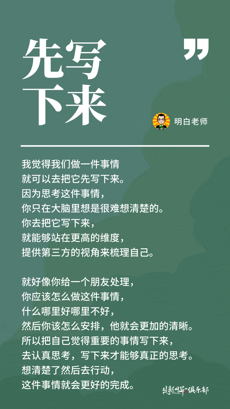 然后我就问他,为什么你会把这些东西写下来?他说因为把东西写下来,我就能够更好的去梳理我要做什么事情,我就能够更清晰的知道我做的事情,我就能够更清晰的去思考事情和事情之间的关联,以及时间安排以及是否有冲突,是否有一些矛盾的地方。这样想思考一遍,我就能够更好的去去知道自己做的事情是对还是不对,有哪些地方需要调整。