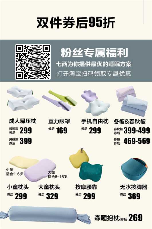 另外需要他们家「七西枕头」优惠的听友们这次也可以关注一下,枕头是有科学分区的设计,更适合颈椎生理曲线,不会让你睡醒肩颈酸痛,落枕,实现翻身自由,可以快速进入深睡眠状态;独特的分码设计可以根据人体的身高体重,头围肩宽选择适合自己的睡眠枕,平时睡不好,肩颈不好的可以去了解看看。